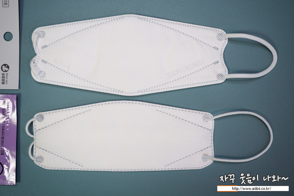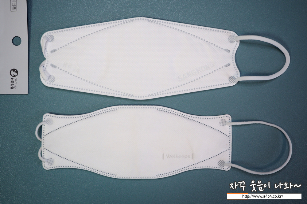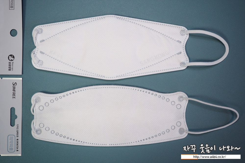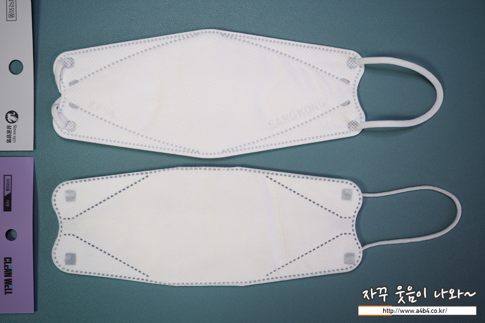 상공양행 마스크 디자인은 가로 삼단접이식 3D스타일 마스크 모양입니다. 참고로 해당 제품은 마스크 금형이 마모되어 금형 교체가 있었다고 합니다. 교체후 접합선이 점에서 - 모양으로 변경 되었다고 합니다. (오늘 리뷰할 마스크는 구형 입니다.)