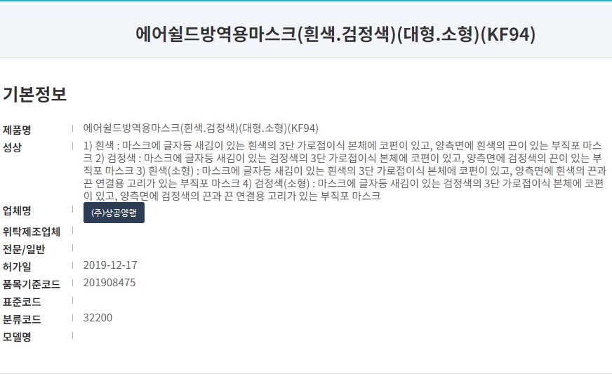 식품의약품안전처 의약품안전나라 등록 제품명은 '에어쉴드 방역용마스크'입니다. KF94 타입으로 색상은 흰색 사이즈는 대형입니다. 2019년 승인된 마스크로 마스크 제조원은 '(주)상공양행'입니다.