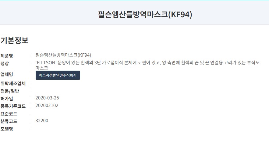 식품의약품안전처 의약품안전나라 등록 제품명칭은 '필슨엠산들방역마스크' 입니다. KF94타입으로 색상은 흰색과 블랙, 사이즈는 대형이 있스며 작년 3월에 허가된 마스크입니다. 제조원은 '에스지생활안전주식회사'