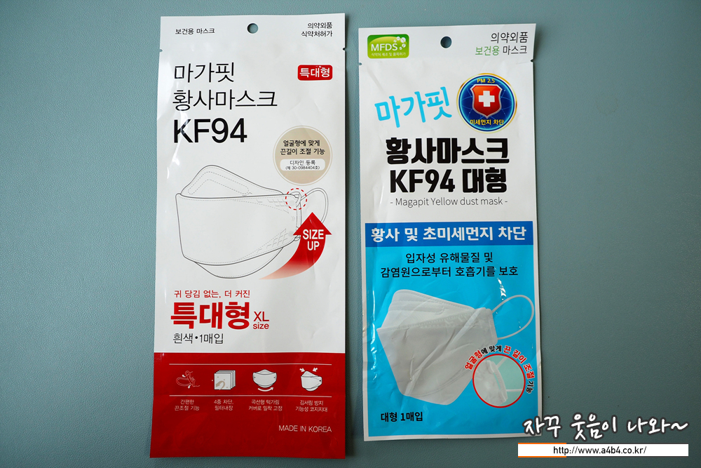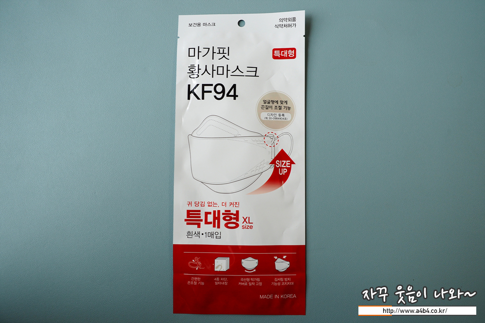 식품의약품안전처 의약품안전나라 등록 제품명은 '마가핏 황사마스크 KF94'로 오늘 리뷰할 사양은 흰색 특대형 제품입니다. 마스크 제조원은 '주식회사 코코팜'으로 작년 4월에 허가된 제품입니다.