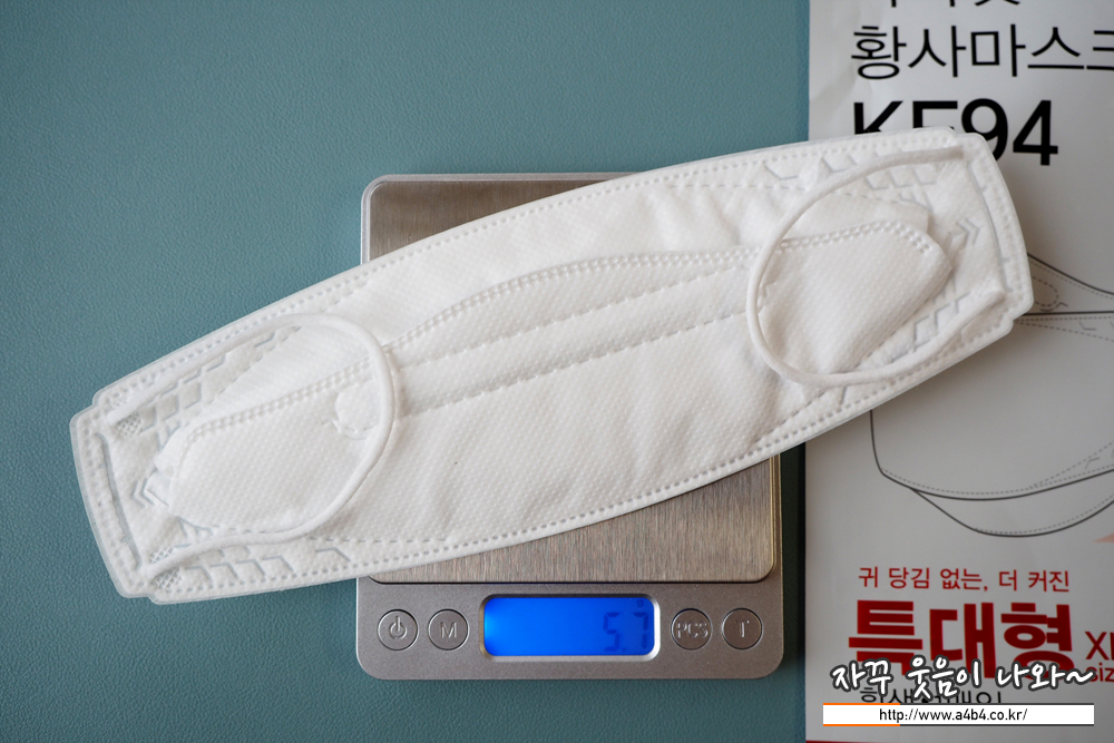 특대형 KF94 마스크인 마가핏 황사마스크 대형 중량은 5.7그램으로 다른 대형 마스크에 비해 무게가 있습니다.