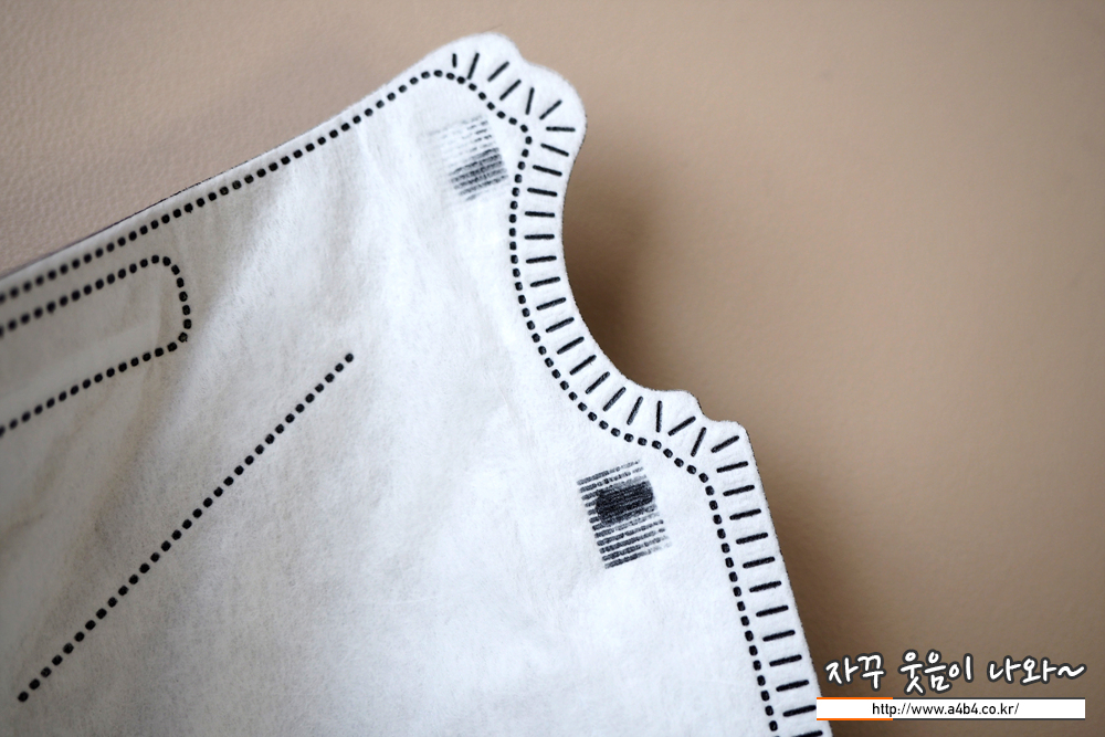 마스크 겉감은 드라이한 촉감을 보이여 약한 패턴처리되어 있습니다. 감촉은 조금 매끄러운 편이며 얇은 타입의 마스크입니다. 두께에 비해서는 상대적으로 하드한 착용감을 보입니다.