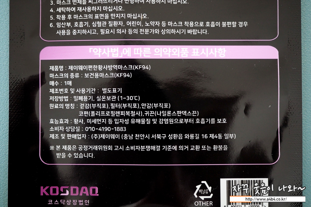 식품의약품안전처 의약품 안전나라 등록명칭은 '제이웨이편한황사방역마스크 (KF94)'입니다. 흰색에 대형사이즈로 작년 9월 허가된 마스크로 제조원은 '주식회사제이웨이'로 KF94와 KF-AD 마스크를 생산하고 있습니다.