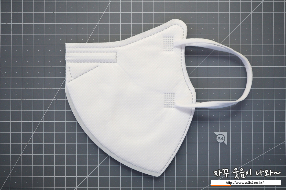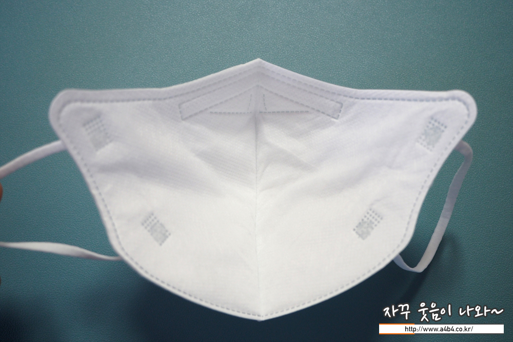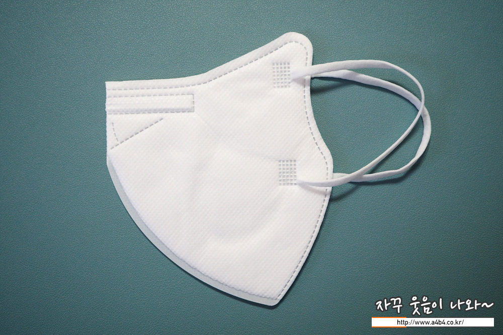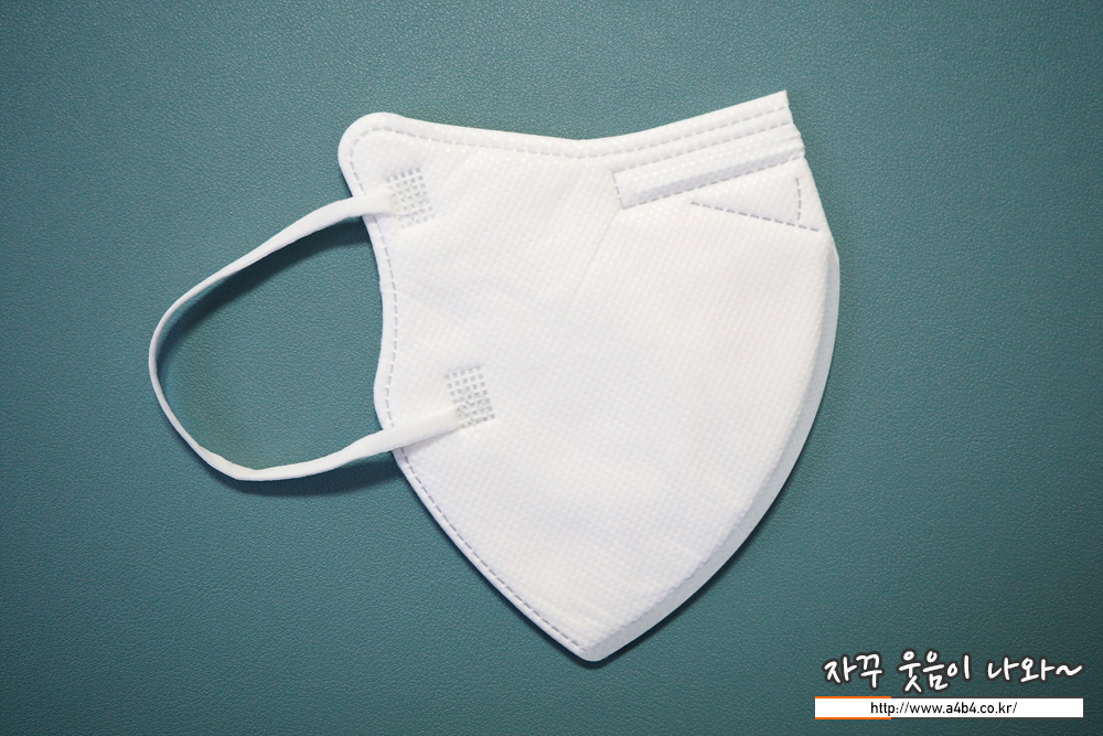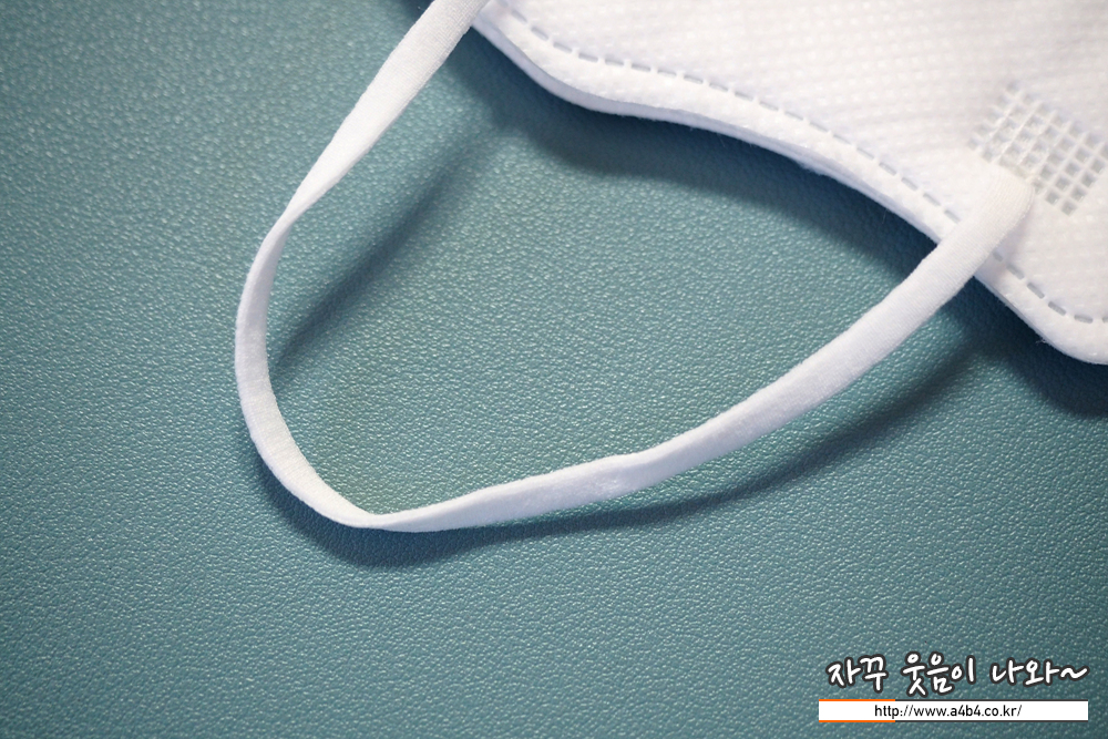 흔히 칼국수끈으로 불리는 납작한 모양의 이어밴드가 마스크 전면에 접착되어 있으며, 이어밴드 탄력은 약간 강한 편입니다.