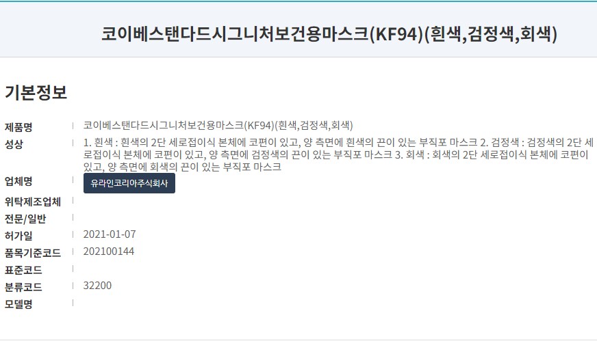 식품의약품안전처 의약품안전나라 등록 제품명은 '코베이 스탠다드 시그니처 보건용마스크 (KF94)'입니다. 흰색 새부리형 마스크로 올해 1월 승인된 신상 마스크 입니다. 마스크 제조원은 '유라인코리아'로 '코베이'브랜드로 두 종의 제품을 생산하고 있습니다. 유통은 건강관련 유통업체임 푸름웰니스에서 판매하고 있습니다.