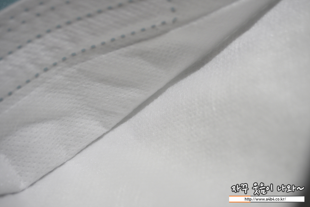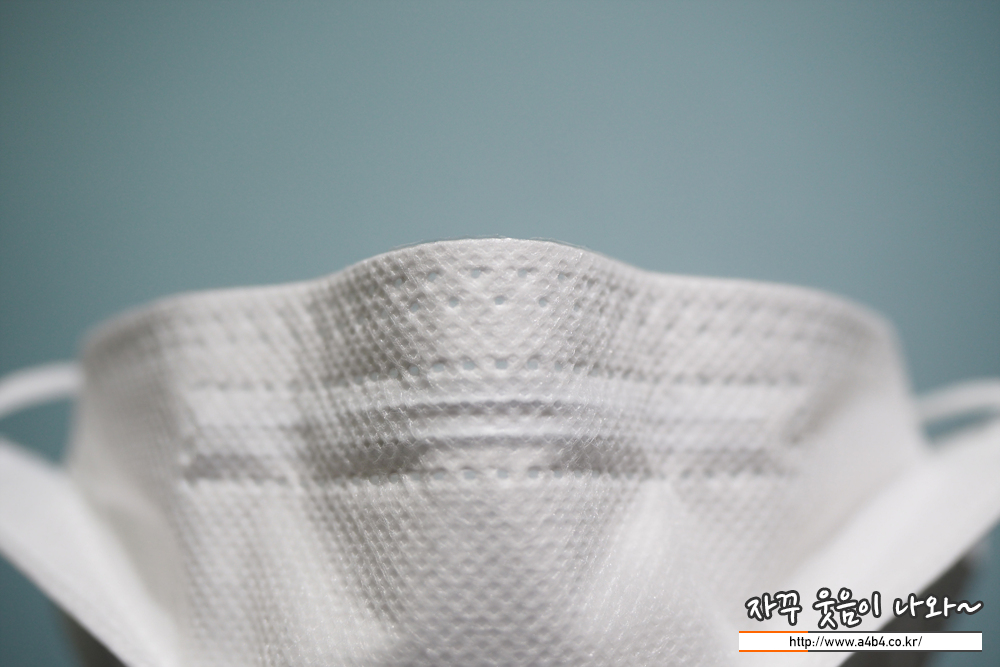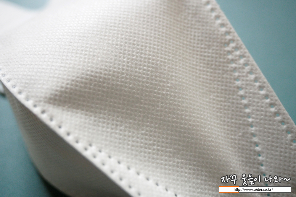 마스크는 외피는 약한 도트처리된 드라이한 감촉의 부직포가 사용되었습니다. 얇고 소프트한 타입으로 착용감과 착용핏도 소프트한 타입입니다. 각이 딱 나오는 착용핏을 보이지는 않습니다. (그렇다고 무너지지도 않지만...)