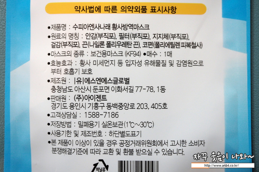 식품의약품안전처 의약품안전나라에 등록된 제품명칭은 '수피아엔사나래황사방역마스크 (KF94)'입니다. 흰색의 대형 입체형 마스크로 작년 10월 승인된 제품입니다. 마스크 제조원은 '(유)에스엔에스글로벌'로 '수피아...' 브랜드를 사용하고 있습니다. 판매원은 아이젠트