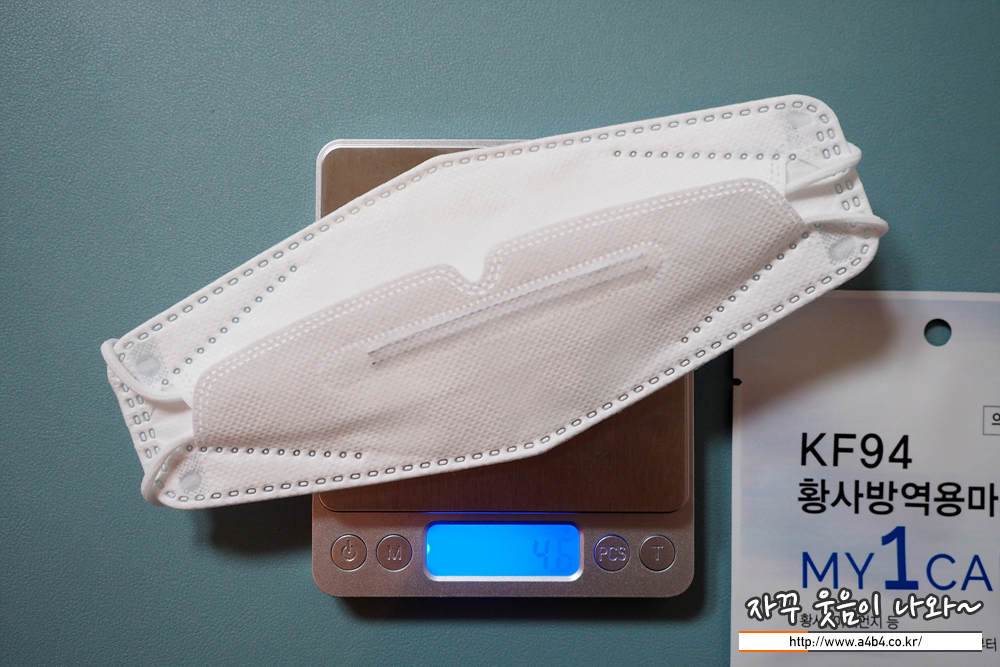 마이원카트 KF94 마스크 무게는 4.6그램으로 일반적인 입체형 대형 사이즈 마스크와 비슷한 무게를 보입니다.