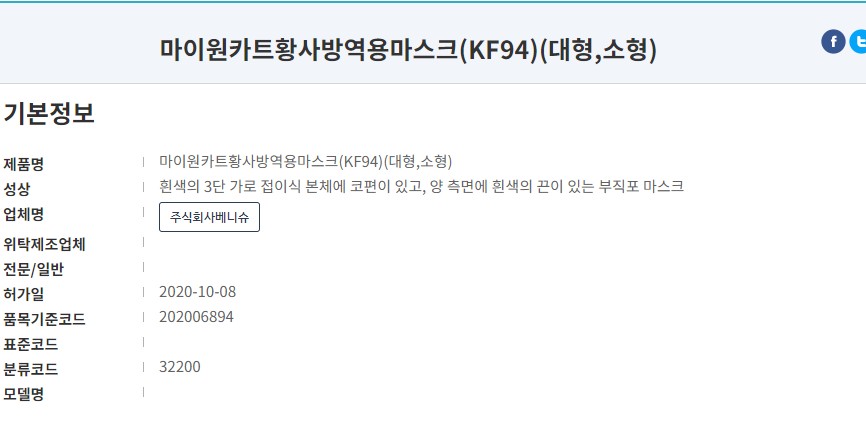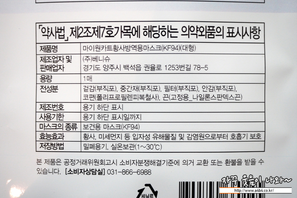 식품의약품안전처 의약품안전나라 등록 명칭은 'KF94 마이원카트 황사방역용마스크' 입니다. 오늘은 대형사이즈 흰색제품 리뷰 진행합니다. 작년 10월 승인된 제품으로 마스크 제조사는 '(주)베니슈'입니다. '마미원'이름으로 여러 마스크를 판매하고 있습니다.