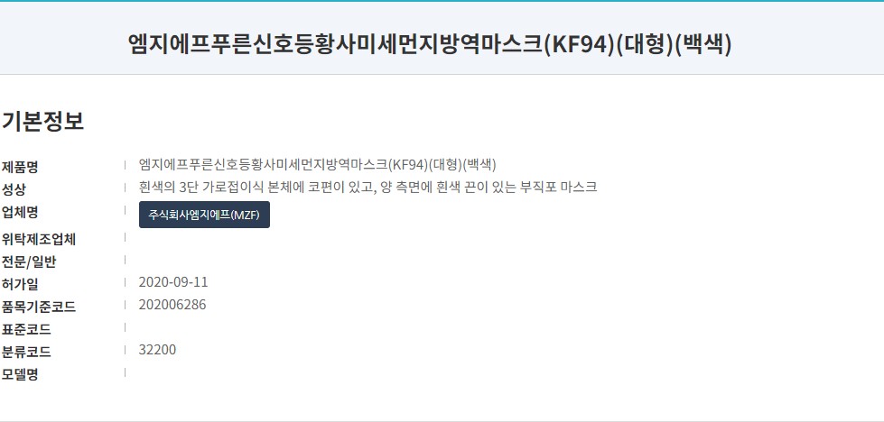 식품의약품안전처 의약품안전나라 등록 명칭은 '엠지에프푸른신호등황사미세먼지방역마스크 (KF94)'로 작년 9월 허가된 제품입니다. 마스크 제조 및 판매는 '주식회사엠지에프(MZF)' 입니다.