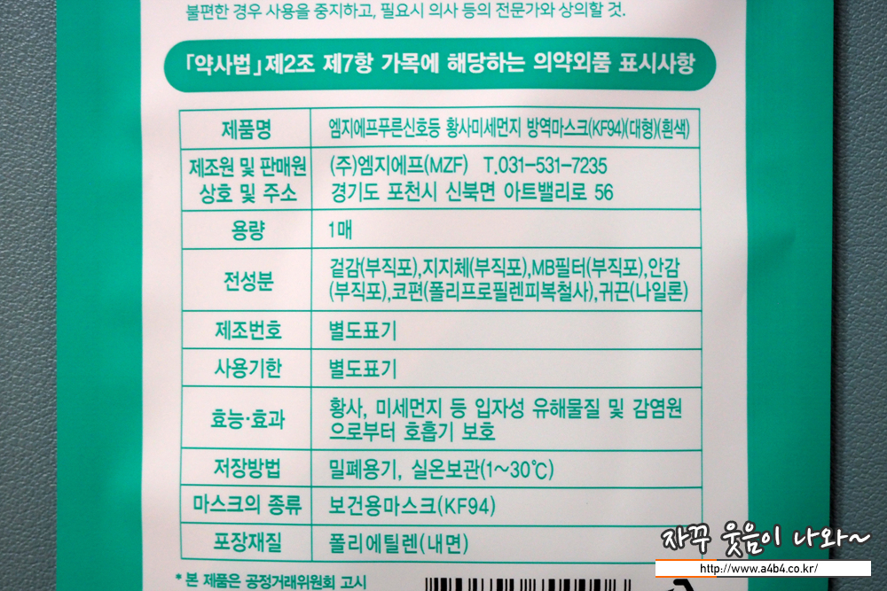 식품의약품안전처 의약품안전나라 등록 명칭은 '엠지에프푸른신호등황사미세먼지방역마스크 (KF94)'로 작년 9월 허가된 제품입니다. 마스크 제조 및 판매는 '주식회사엠지에프(MZF)' 입니다.