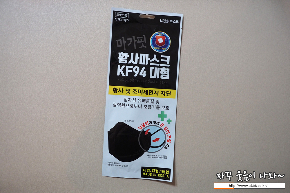 식약처 등옭 제품명칭은 '마가핏 황사마스크'로 KF94타입의 제품입니다. 오늘은 대형, 블랙제품으로 리뷰합니다. 마스크 제조사는 주식회사코코팜으로 작년 4월 승인된 마스크입니다.