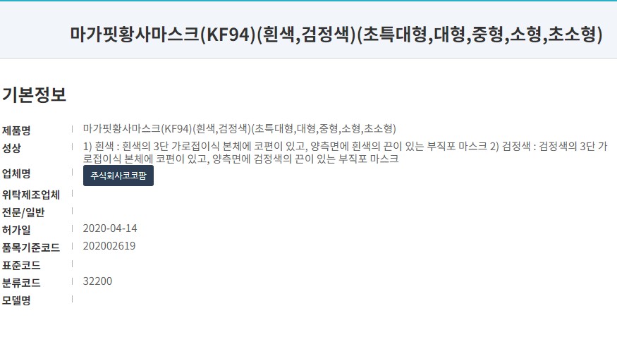 식약처 등옭 제품명칭은 '마가핏 황사마스크'로 KF94타입의 제품입니다. 오늘은 대형, 블랙제품으로 리뷰합니다. 마스크 제조사는 주식회사코코팜으로 작년 4월 승인된 마스크입니다.