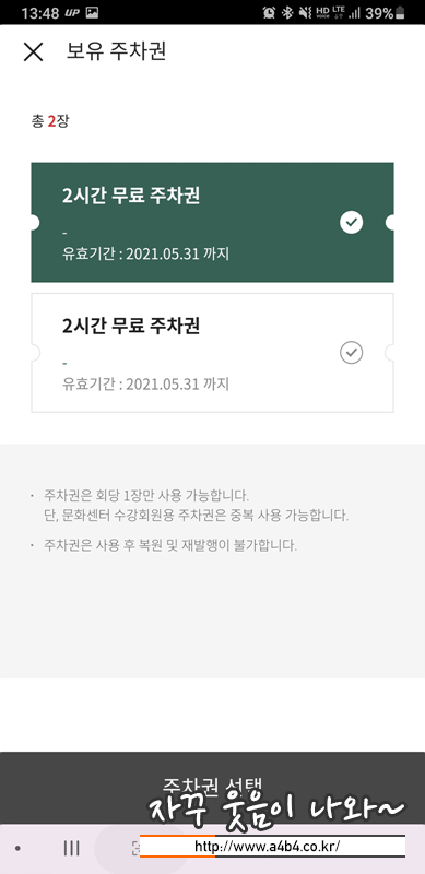 또한 현대백화점 앱을 성치하고 인증하면, 매월 2시간 무료 주차권 두 장이 나오네요. 한 번에 두 장 사용은 안되고요. 아래와 같이 현대백화점 앱에서 무료주차권 적용이 가능합니다.