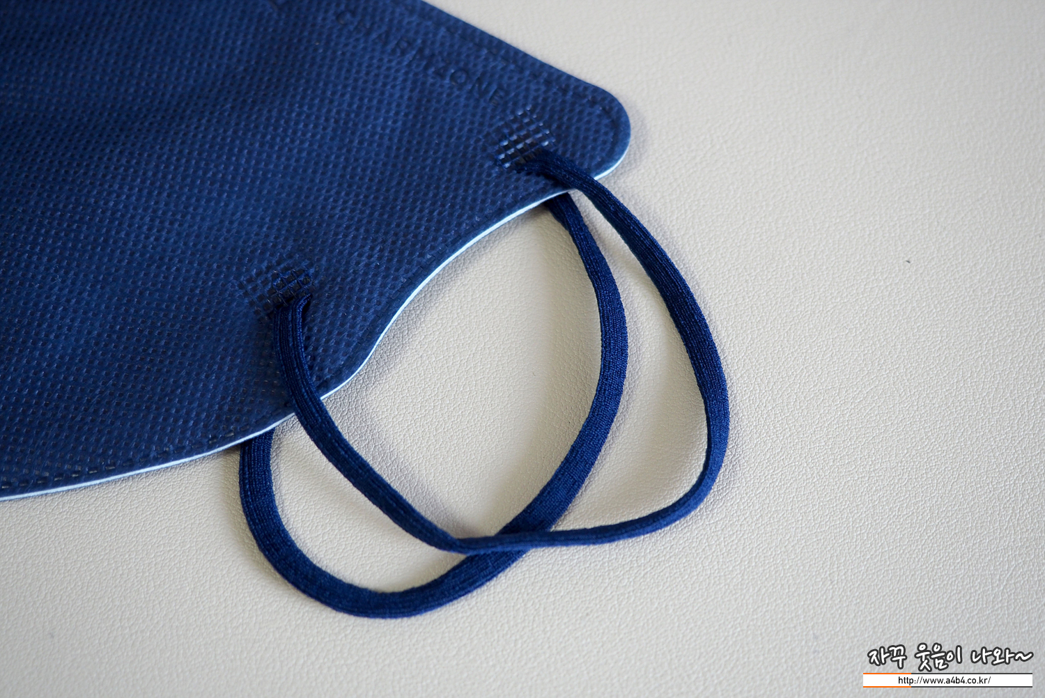 칼국수끈으로 불리는 납작 타입의 끈이 이어밴드로 마스크 앞면에 부착 되었으며, 이어밴드 탄력은 약간 강합니다.
