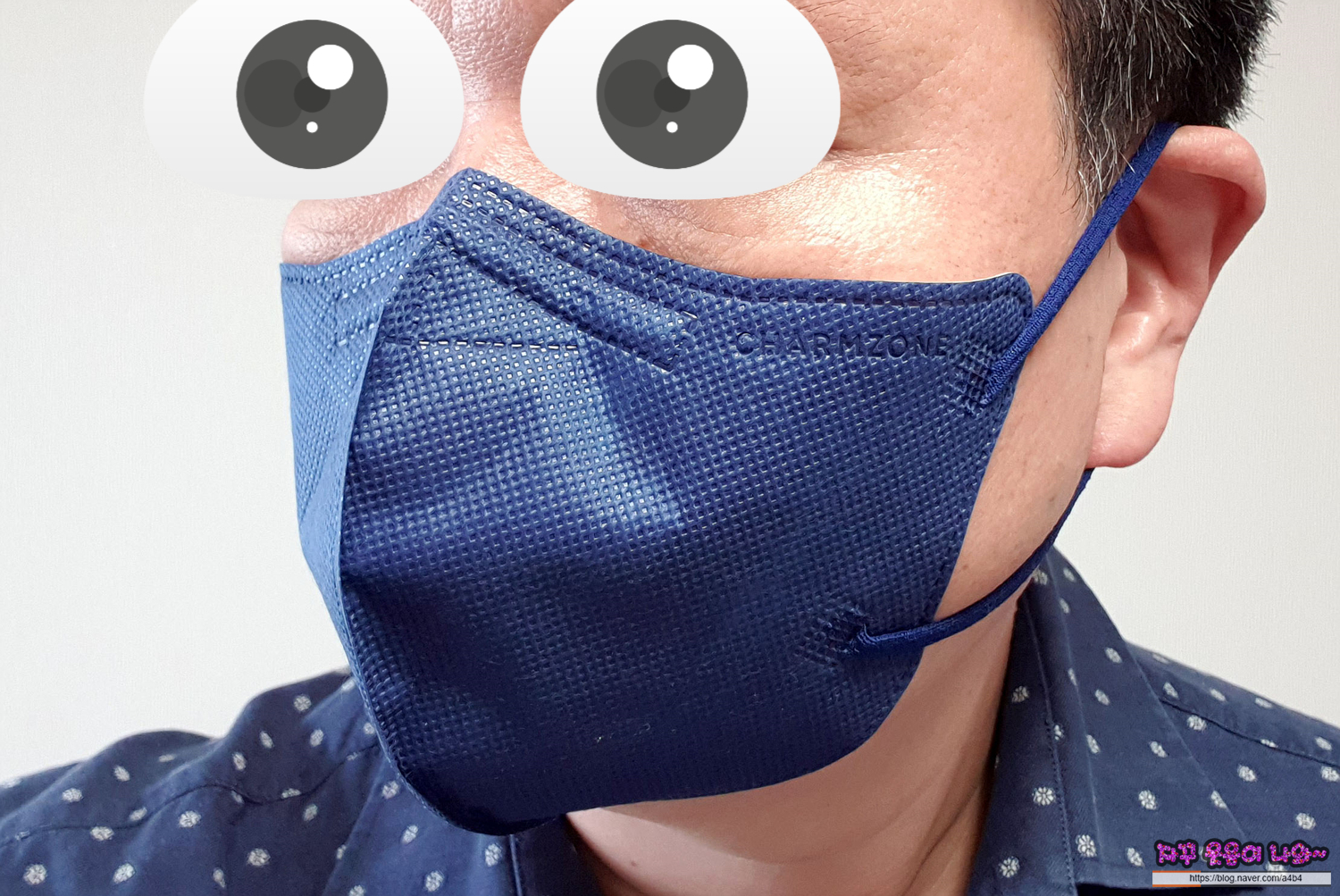 도트처리된 외피가 사용된 참존 마스크는 댄디업 네이비는 반유광 타입으로 상당히 깔끔한 발색을 보입니다. 마스크는 3중 구조 타입으로 다른 KF마스크에 비해 얇은 타입으로 가볍고 편한 착용감을 보입니다. 얇지만 상대적으로 하드한 타입으로 착용핏은 잘 나오지만, 숨을 깊게쉬면 마스크가 힘을 쓰지는 못합니다.