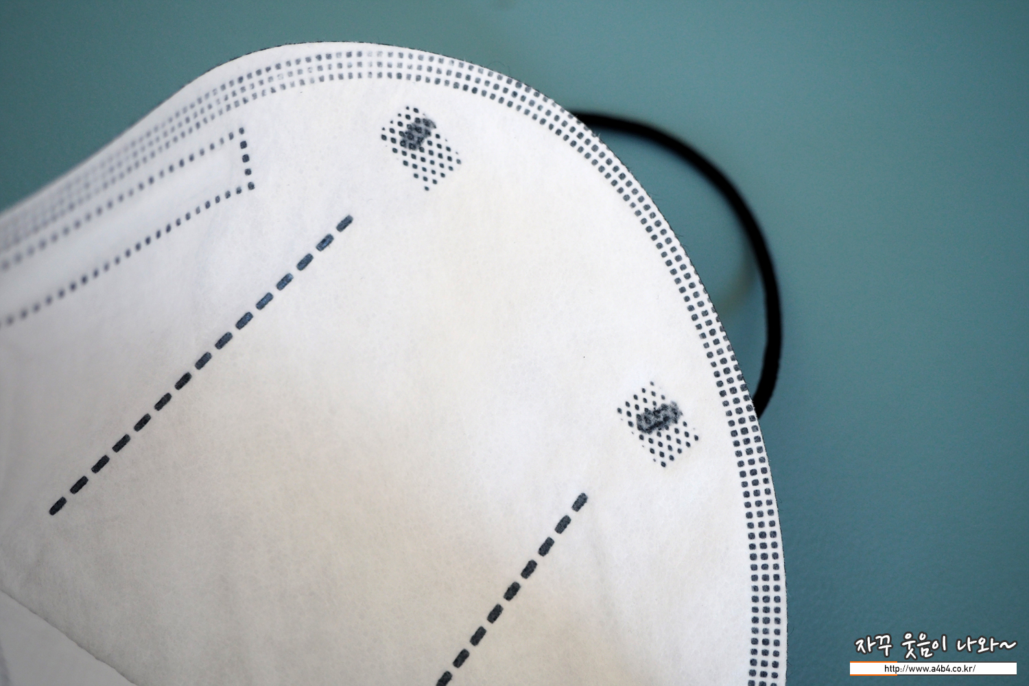 둥근 모양의 귀걸이끈은 마스크 앞 부분에 접착되어 있습니다. 귀걸이끈 탄력은 약간 짱짱한 타입으며, 하루가드 프리이엄 마스크의 귀걸이끈은 귀에 자극이 덜하는 납작한 타입의 귀걸이끈이 아닌 둥근 모양이 사용된 부분은 조금 아쉬운 부분입니다.