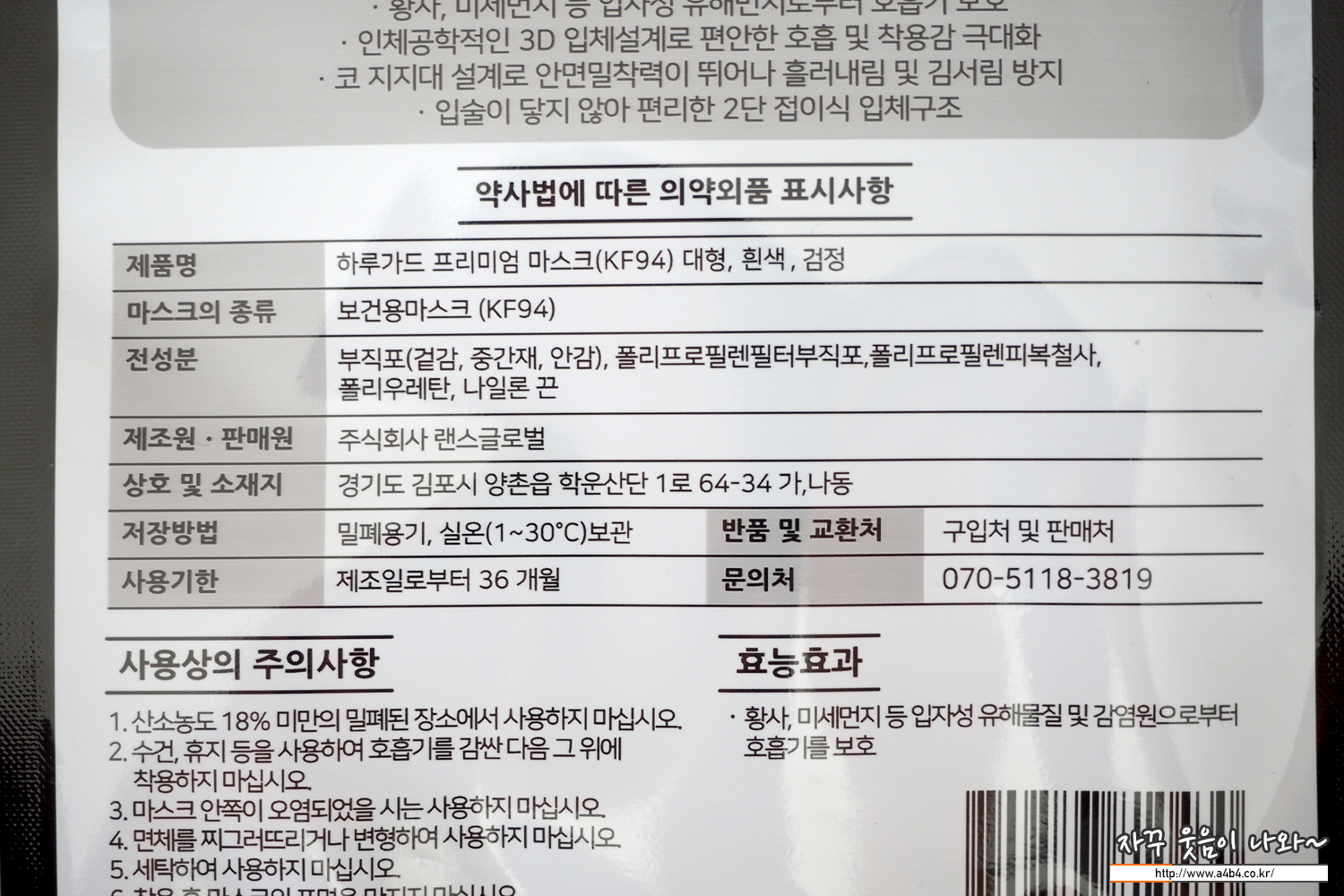 식품의약품안전처 의약품안전나라 등록 제품명은 '하루가드프리미엄마스크(KF94)'로 오늘 리뷰는 블랙색상 대형사이즈 마스크입니다. 작년 12월 승인된 제품으로 마스크 제조사는 '(주)랜스글로벌'입니다.