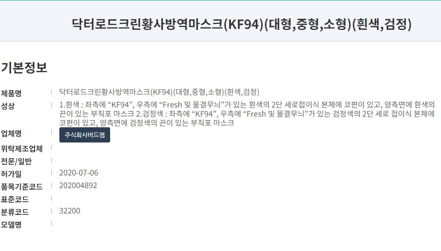 식품의약품안전처 의약품안전나라 등록 제품명칭은 '닥터로드크린황사방역마스크(KF94)'입니다. 사이즈는 대형으로 마스크 색상은 흰색과 블랙이 있습니다. 작년 07월 승인된 마스크로 제도사는 주식회사버드엠입니다. 여러 브랜드로 보건용 마스크를 제작하고 있는 곳입니다.
