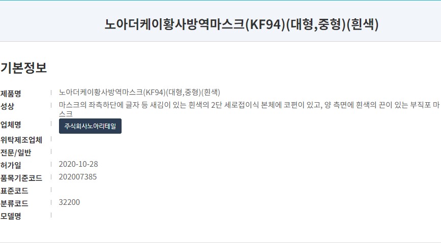 의약품안전나라 등록명칭은 '노아 더케이 황사방역마스크 (KF94)'입니다. 흰색의 대형 마스크로 작년 10월 식약처 승인된 제품입니다. 마스크 제조사는 '주식회사 노아리테일'로 등록되어 있습니다. 리뷰시점 기준으로 해당 제품 한 종만 생산하고 있습니다.