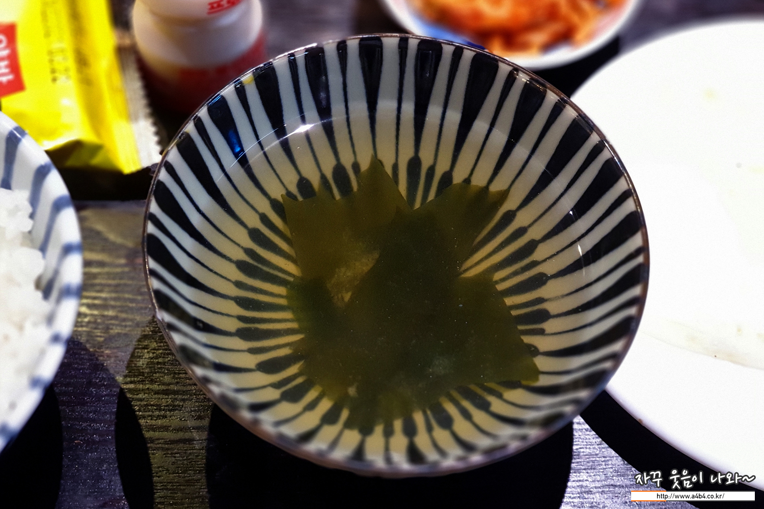 연두부 피클, 무채 등의 기본 반찬과 담백한 미역국 그리고 흰 쌀밥....
