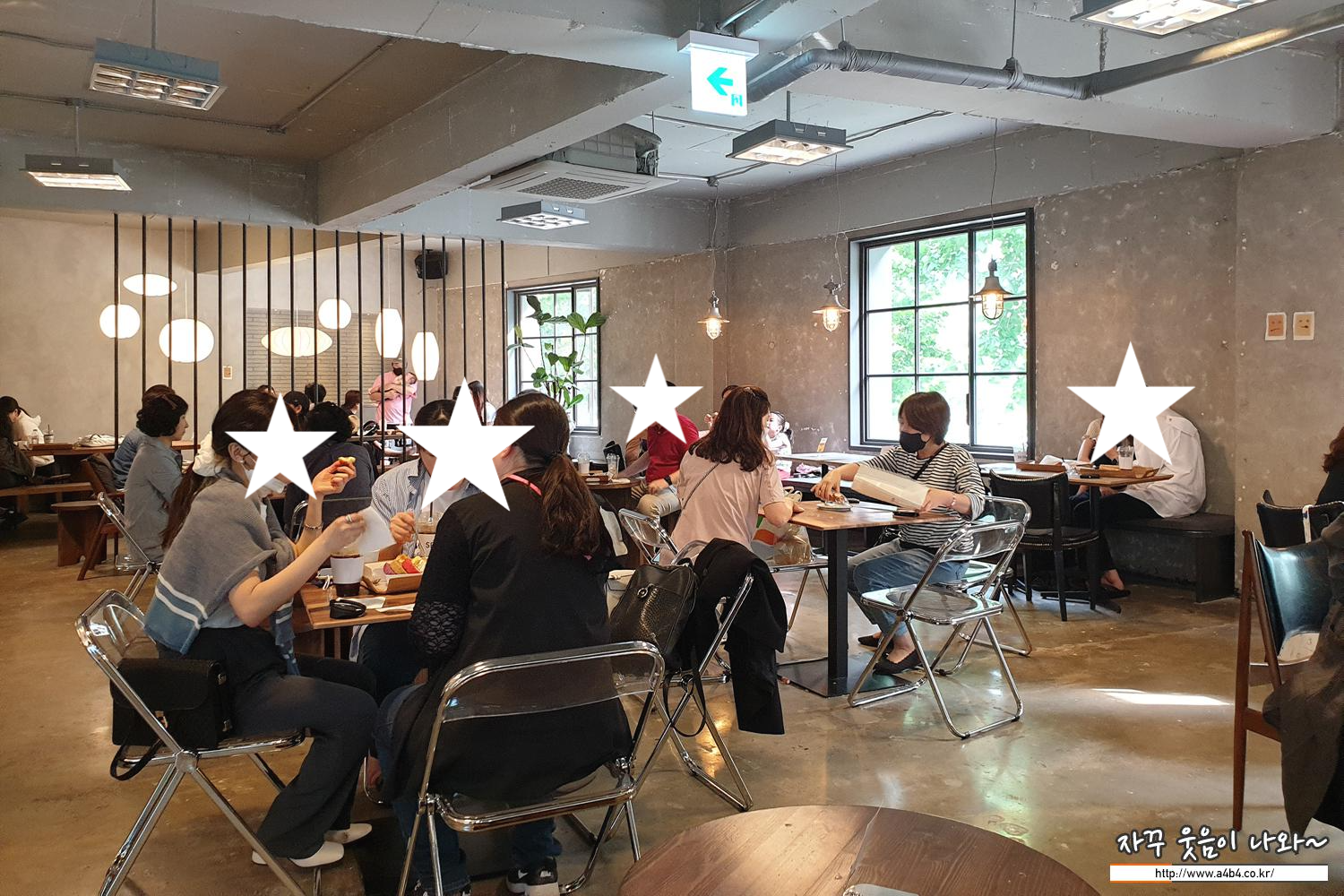 창가쪽으로 3~4인 정도가 앉아서 빵을 먹을 수 있는 공간들이 준비되어 있습니다. 다만 코로나19 사회적 거리두기로 인해서 공간의 반 정도만 이용이 가능하네요.