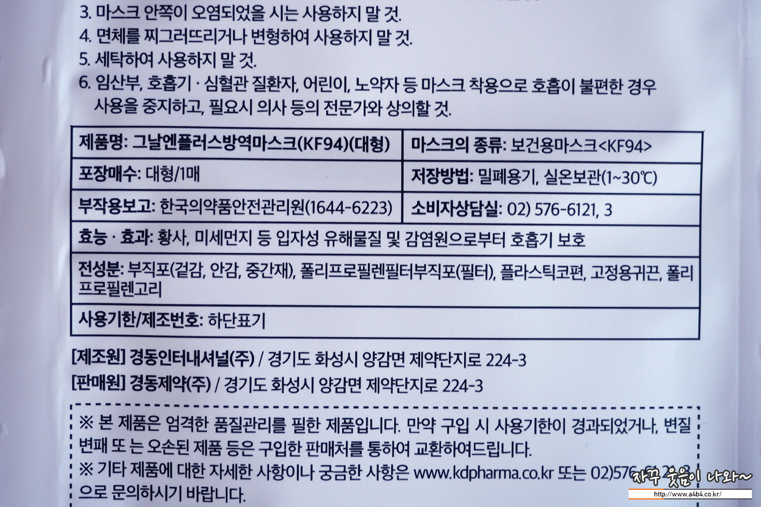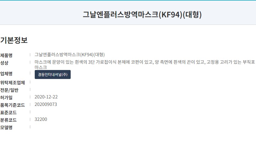 식약처 등록 명칭은 '그날엔플러스방역마스크(KF94)'입니다. 흰색컬러 대형크기의 마스크로 작년 12월 승인된 제품입니다. 마스크 제조사는 '경동인터내셔널(주)'로 기존 그날엔 애니 마스크 제조사에서 변경되었습니다.