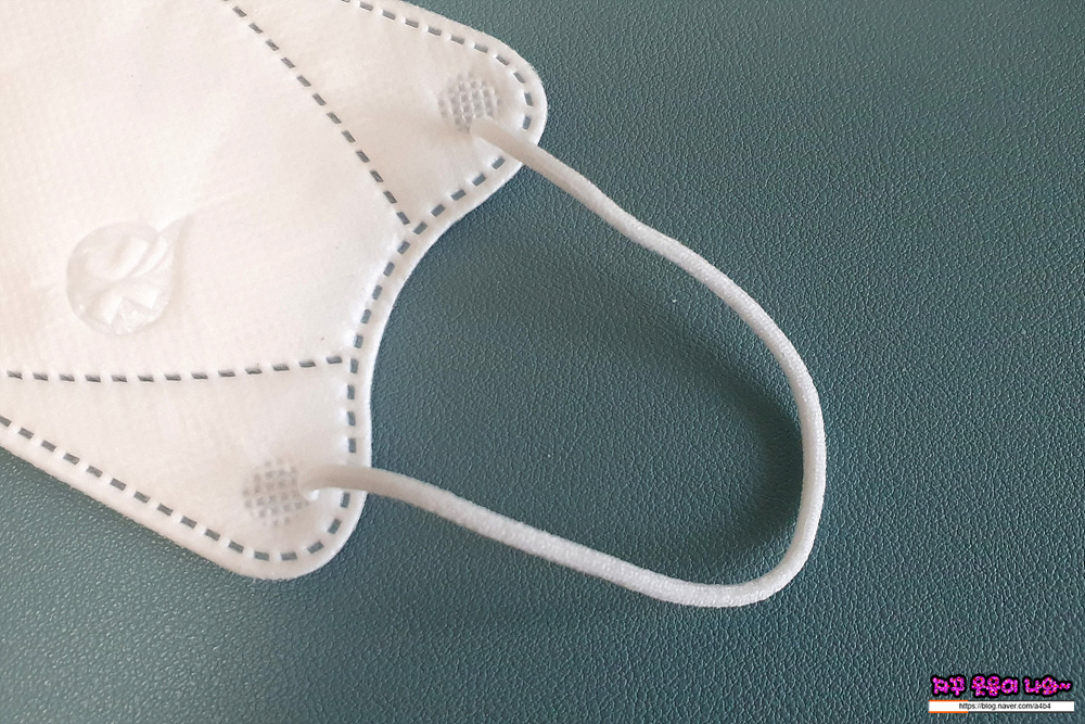 둥근 모양의 귀걸이끈이 마스크 앞면에 접착되어 있으며, 접착 상태는 양호합니다. 귀걸이끈 탄성은 보통수준 입니다.