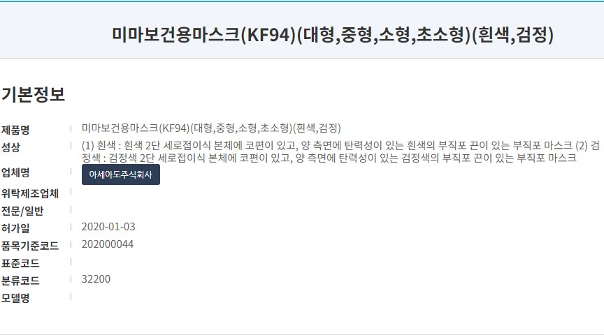 식품의약품안전처 의약품안전나라 등록 명칭은 '미마보건용마스크 (KF94)' 로 흰색 L 대형 사이즈 제품입니다. 코로나 바이러스가 국내 확산전인 작년 1월 승인된 제품이지만 오늘 리뷰하는 대형은 올해 4월에 출시된 제품입니다. 이 전에는 M중형이 주력 제품이었네요. 마스크 제조원은 '아세아도주식회사'로 KF94, KF80 미마마스크 두 타입만 생산하고 있습니다. 오직 이 모델로 승부하는...