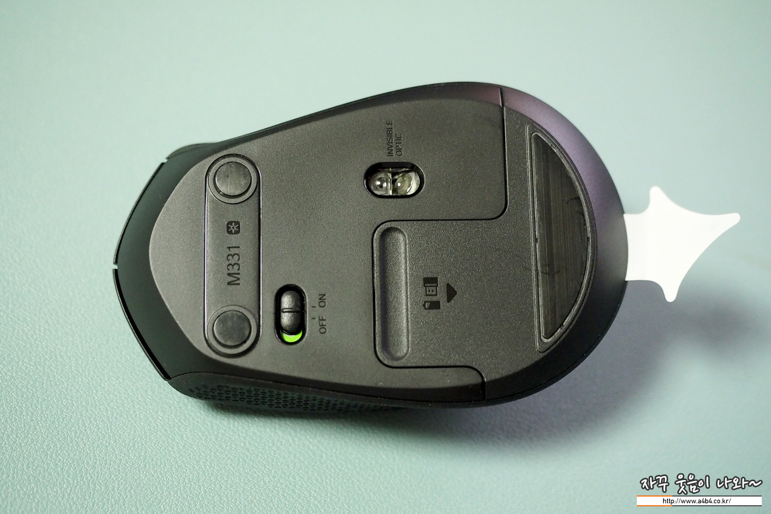 M331 마우스 하단입니다. 광반사 방식의 렌즈와 전원버튼, 그리고 배터리 커버가 보입니다.
