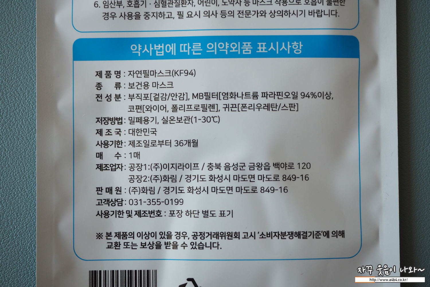 식약처 등록명칭은 '자연필마스크 (KF94)'로 대형/흰색 마스크입니다. 마스크 제조원은 주식회사화림으로 작년 12월 식약처 허가된 마스크입니다.