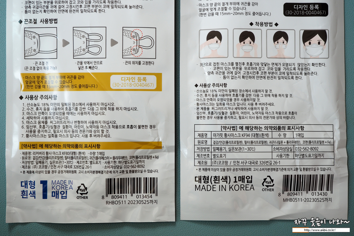 동일 제조사인 코코팜에서 생산하는 KF94 마가핏 마스크 대형과 비교.