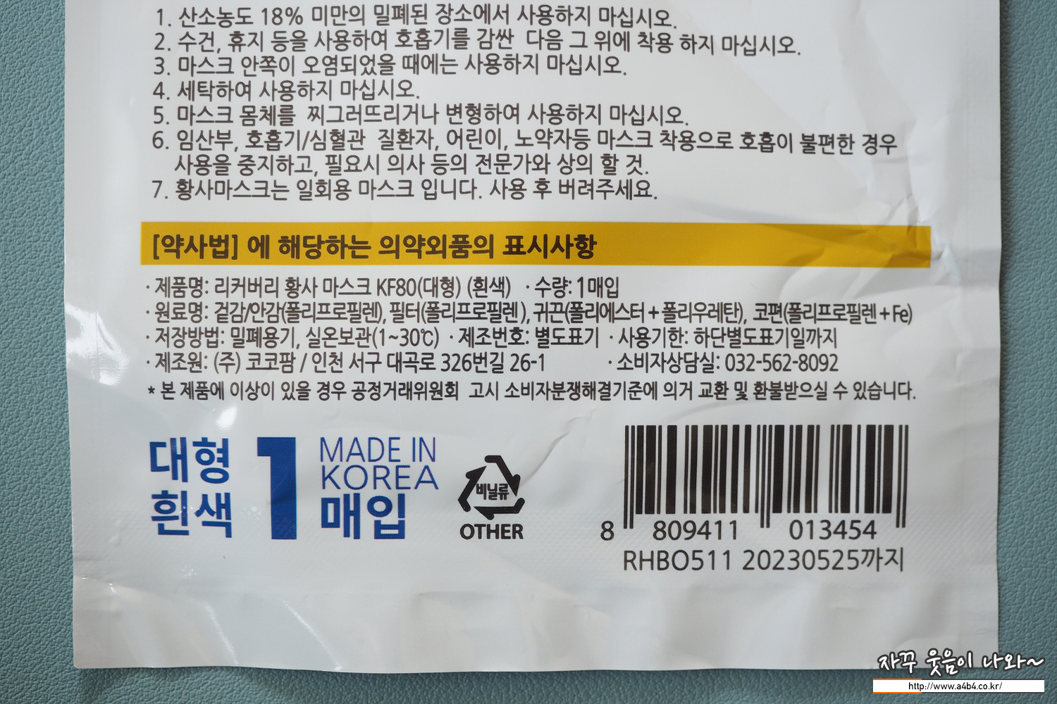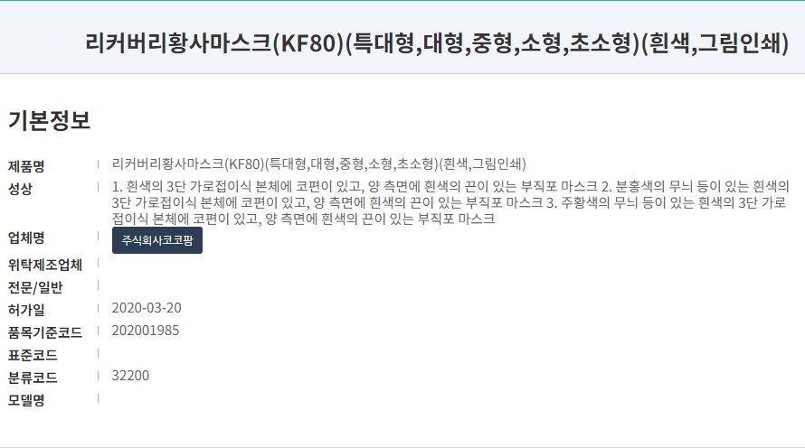 식약처 등록 명칭은 '리커버리 황사마스크 (KF80)'로 오늘 리뷰는 대형 사이즈 입니다. 이 외에도 특대형, 초소형 사이즈가 있는 것으로 안내되어 있으나 KF80 특대형 제품은 확인하지 못했네요. 작년 3월 승인된 제품으로 마스크 제조사는 주식회사 코코팜입니다.