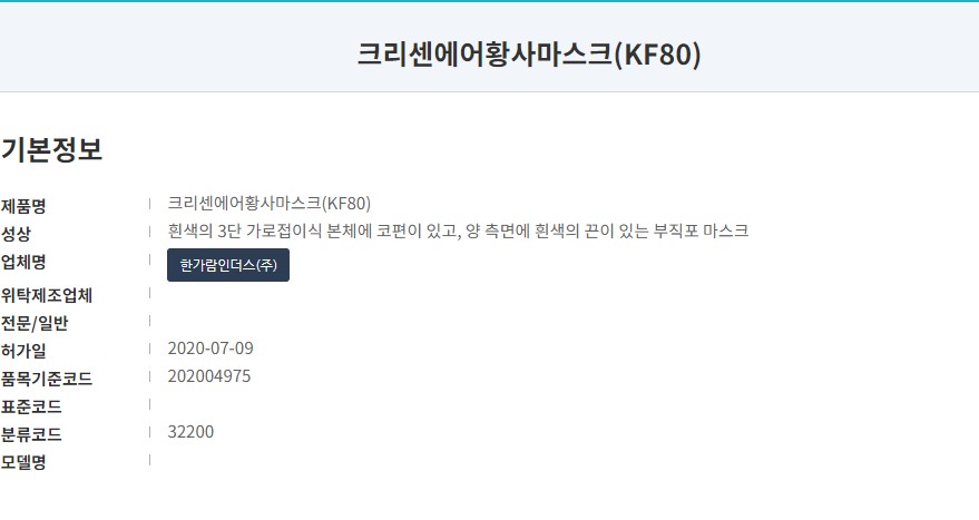 식약처 등록 제품명은 '크리센에어황사마스크'입니다. KF80과 KF94 제품이 있으며 작년 7월에 승인된 마스크입니다. 제조사는 한가람인더스 주식회사로 'Chryson' 브랜드로 여러 타입의 마스크를 생산하고 있습니다.