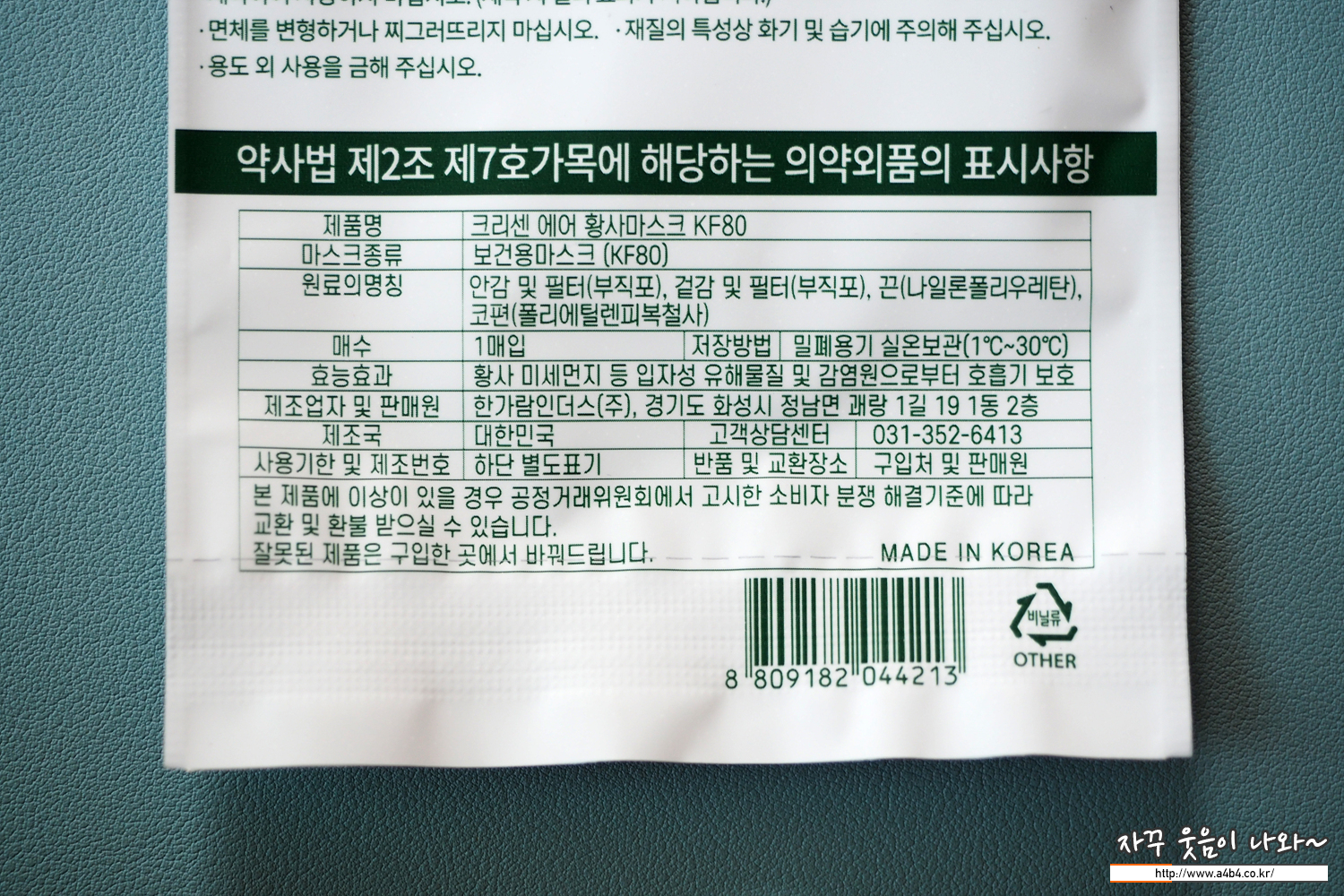 크리센 황사마스크 KF80 대형 무게는 4.4그램으로 일반 Kf80 대형마스크 무게를 보입니다.