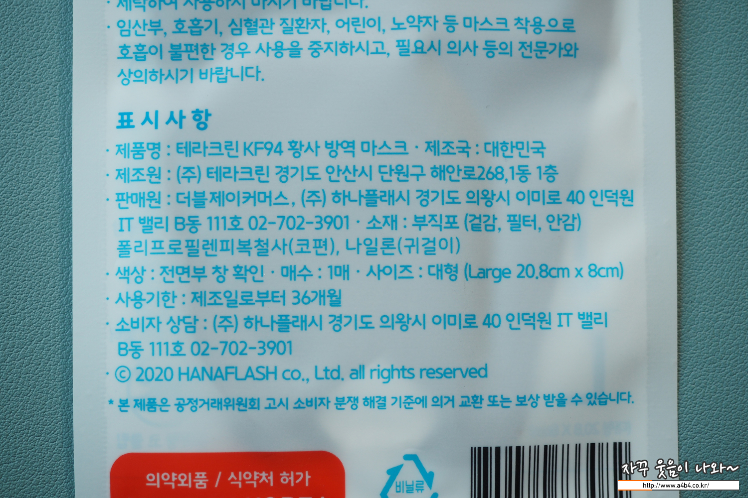 식품의약품 안전처 의약품 안전나라 등록 제품명은 '테라크린황사방역마스크(KF94)(흰색) (검정색)' 입니다. 작년 11월 승인된 마스크로 제조사는 '주식회사테라크린'으로 등록되어 있습니다.
