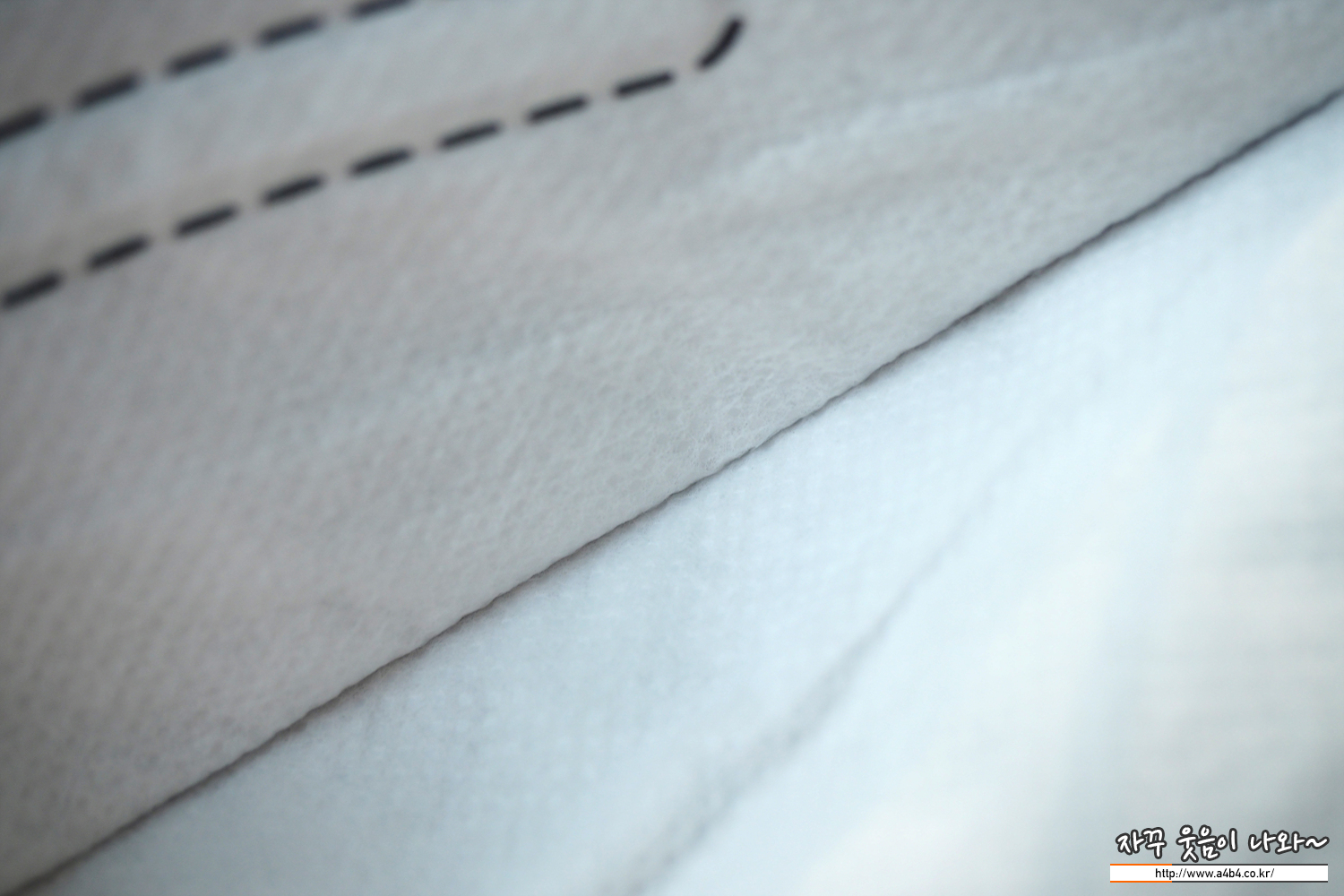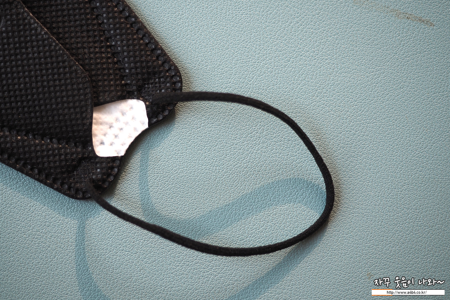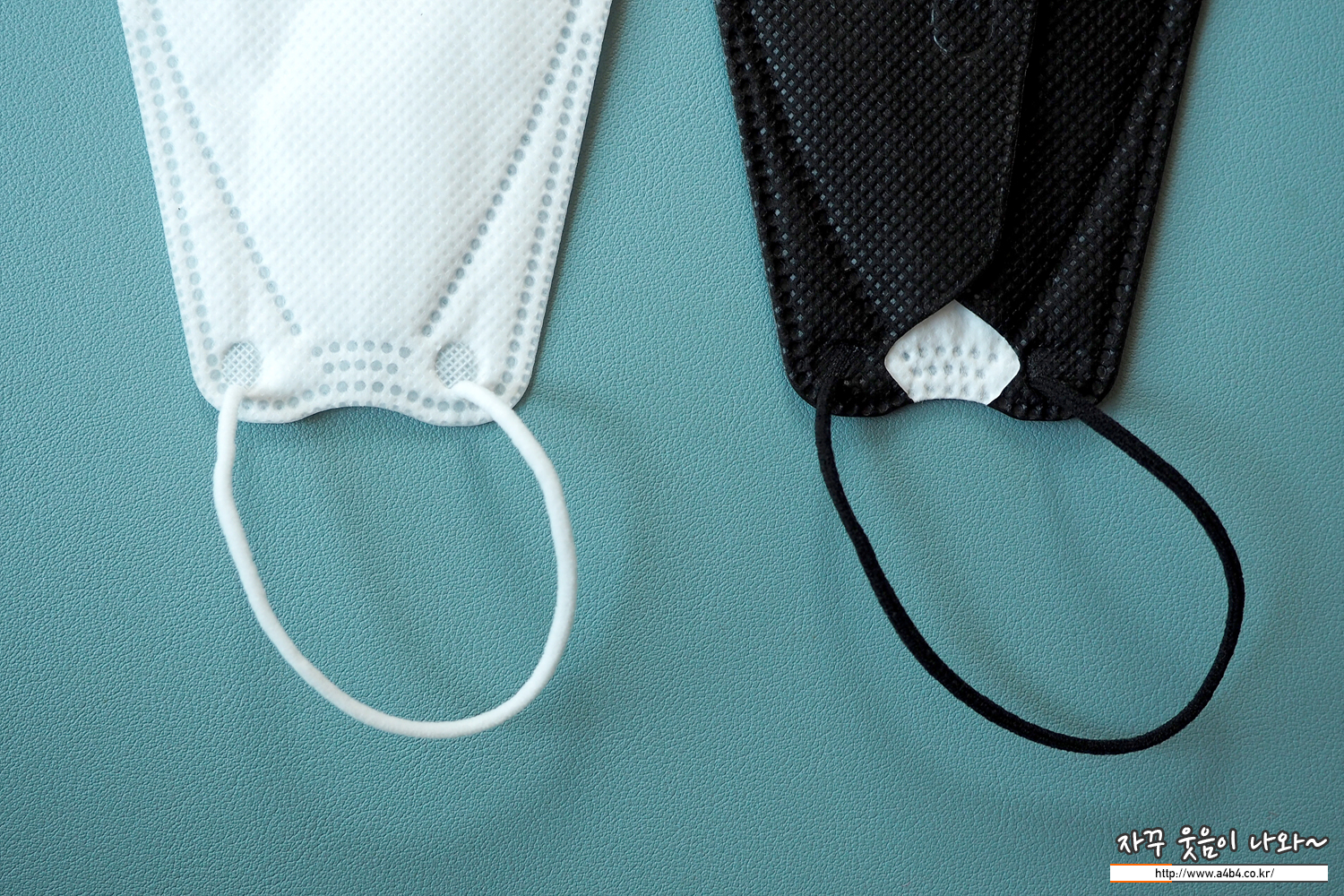 먼저 외형 디자인은 동일하지만, 이어밴드 접착위치는 흰색은 앞 부분에 검정은 뒷 부분에 접착되어 있습니다. 이어밴드 탄성도 검정 제품이 조금 약해 보이고요. 마스크 내피는 흰색이 상대적으로 부드러운 촉감과 착용감을 보입니다.