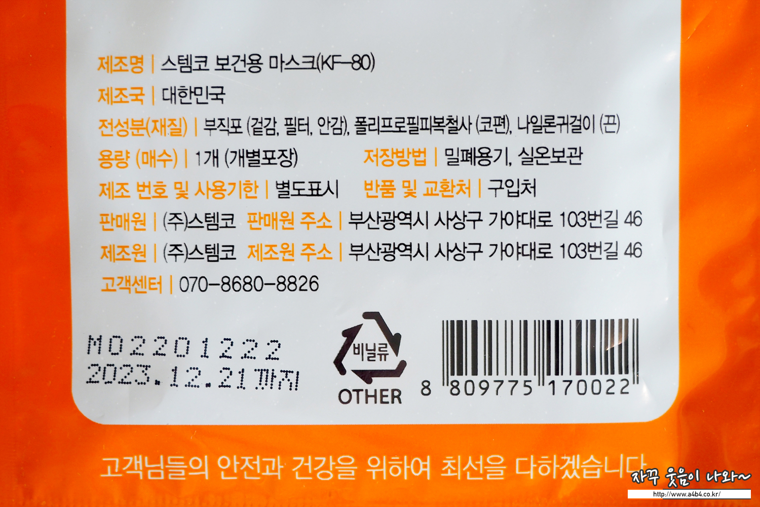 식약처에 등록된 명칭은 '스템코보건용마스크 (KF80)'입니다. 흰색의 대형 KF80 마스크로 작년 11월 식약처 승인된 제품입니다. 마스크 제조원은 식약처 정보기준 '㈜스템코제3공장'으로 등록되어 있습니다. 패키지에는 '(주)스템코'로 되어 있네요.