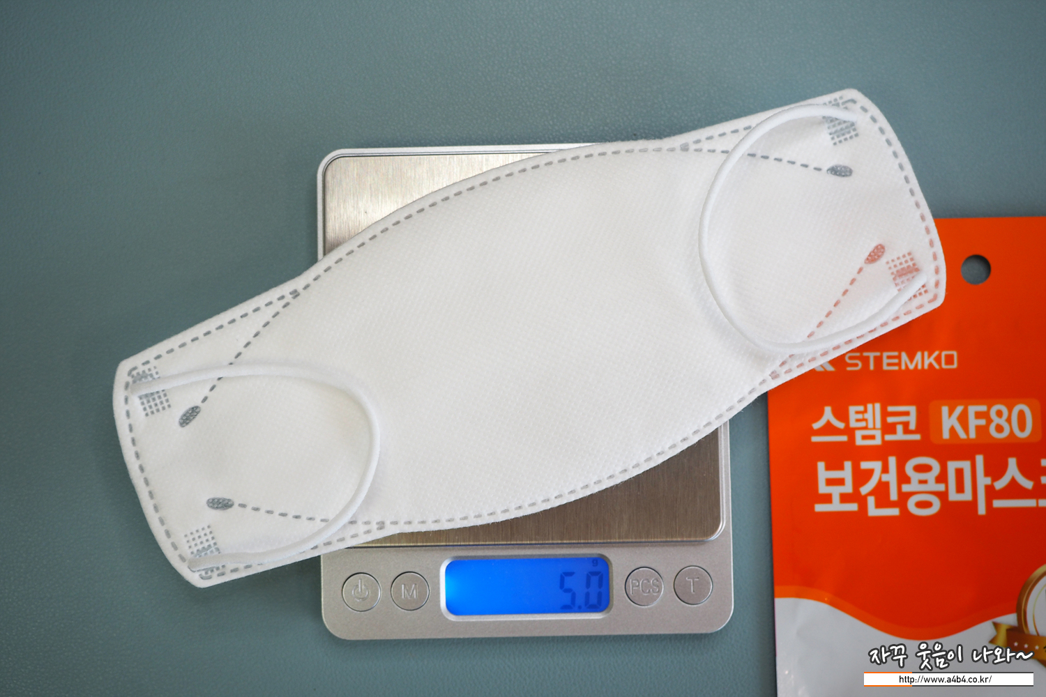 (주)스템코 스템코 보건용마스크 KF80 대형 무게는 5.0그램으로 일반적인 대형 크기 마스크 무게와 비슷합니다.