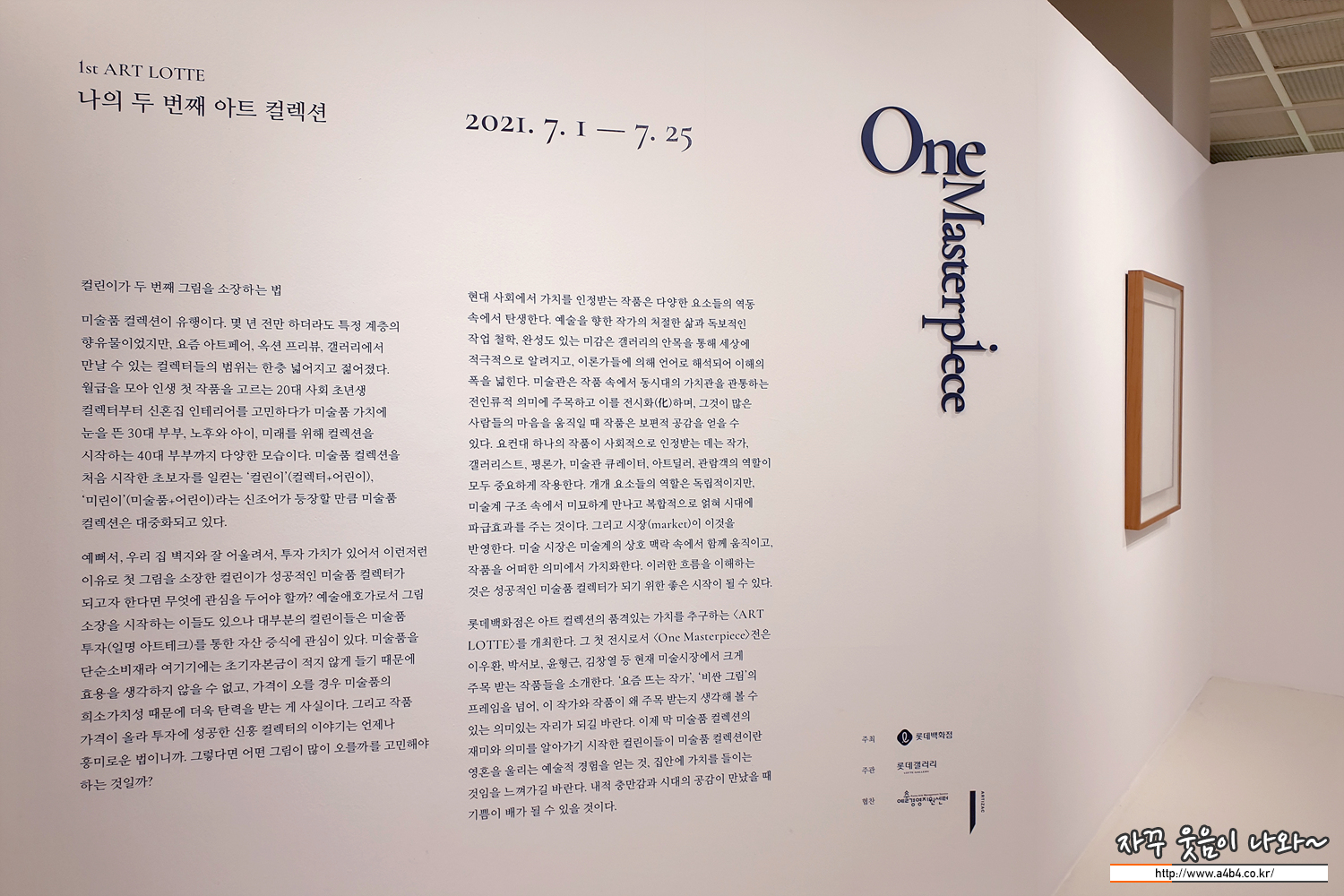 이번 잠실 롯데월드몰 에비뉴엘 아트홀에서 열리는 '「One Masterpiece-나의 두 번째 아트 컬렉션」 展'은 작은 규모의 전시회지만, 현대 국내 회화의 흐름과 작품을 만나볼 수 있는 상당히 매력적인 전시회 입니다.