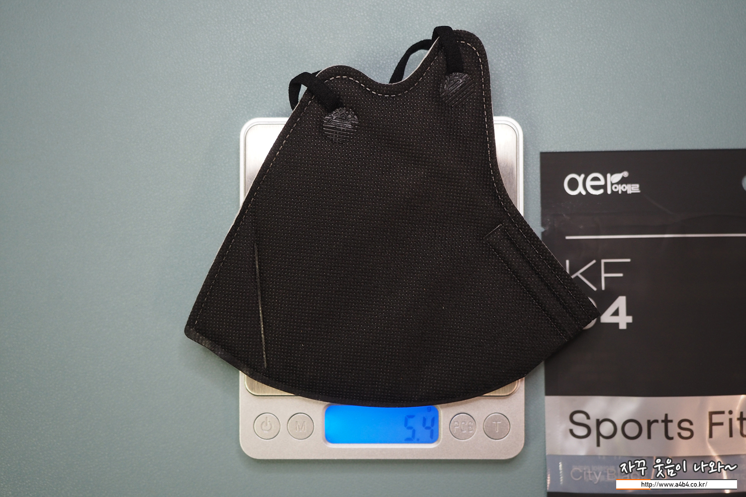 KF94 아에르 스포츠베이직 보건용마스크 대형 무게는 5.4g으로 대형 사이즈 새부리형 마스크 중에서는 무게가 조금 있는 제품입니다.