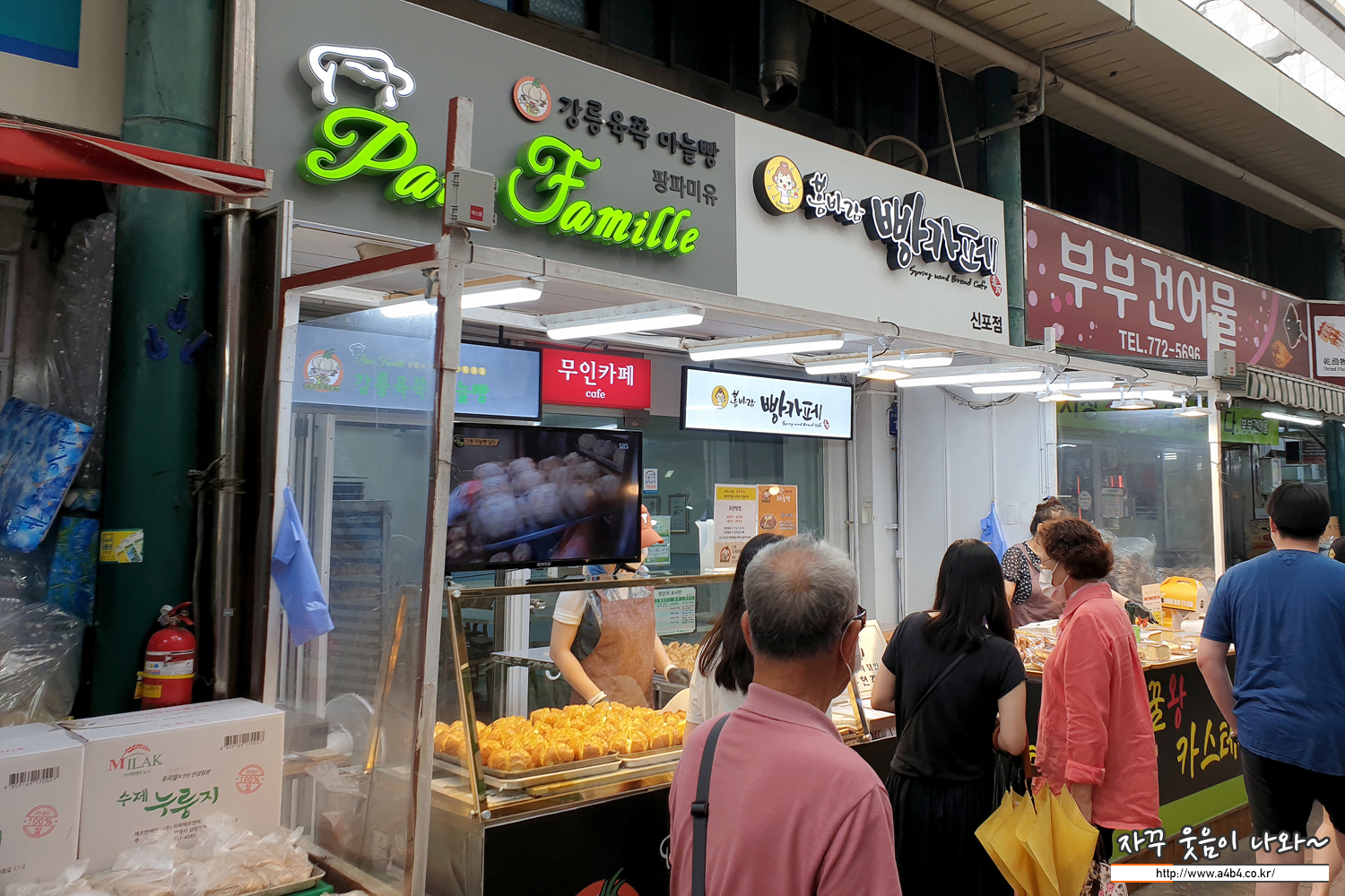 시장 입구가 여러 곳인데, 대로변에 파리바케트와 CU가 있는 입구로 들어오세요. 그러면 바로 원조 신포닭강정 등 여러 업소를 만날 수 있습니다.