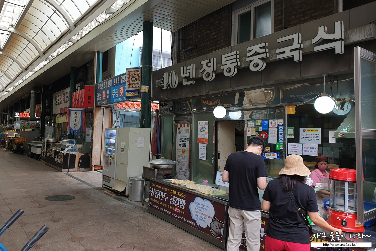 시장 입구가 여러 곳인데, 대로변에 파리바케트와 CU가 있는 입구로 들어오세요. 그러면 바로 원조 신포닭강정 등 여러 업소를 만날 수 있습니다.