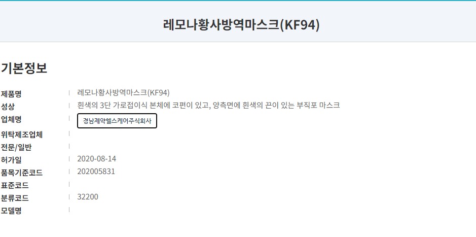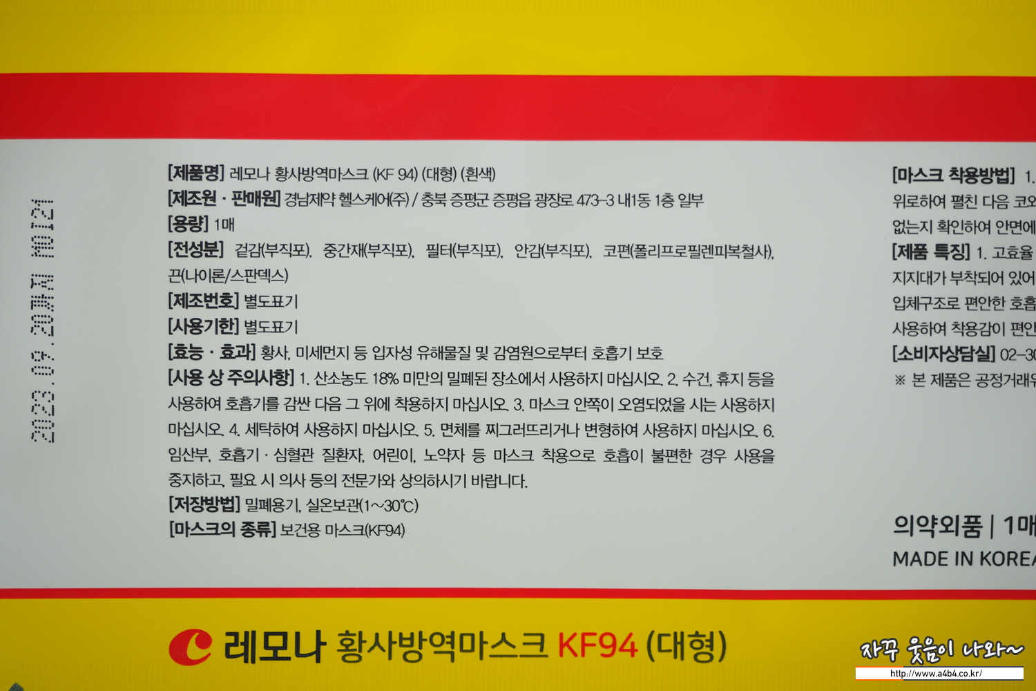 식약처에 등록된 명칭은 '레모나 황사방역마스크 KF94'입니다. 마스크 제조원은 '경남제약 헬스케어 주식회사'로 작년 8월에 승인된 마스크입니다. 몰랐는데 레모나 브랜드로 다양한 제품이 등록되어 있네요 (제품 리스트는 글 하단에서 확인 가능합니다)