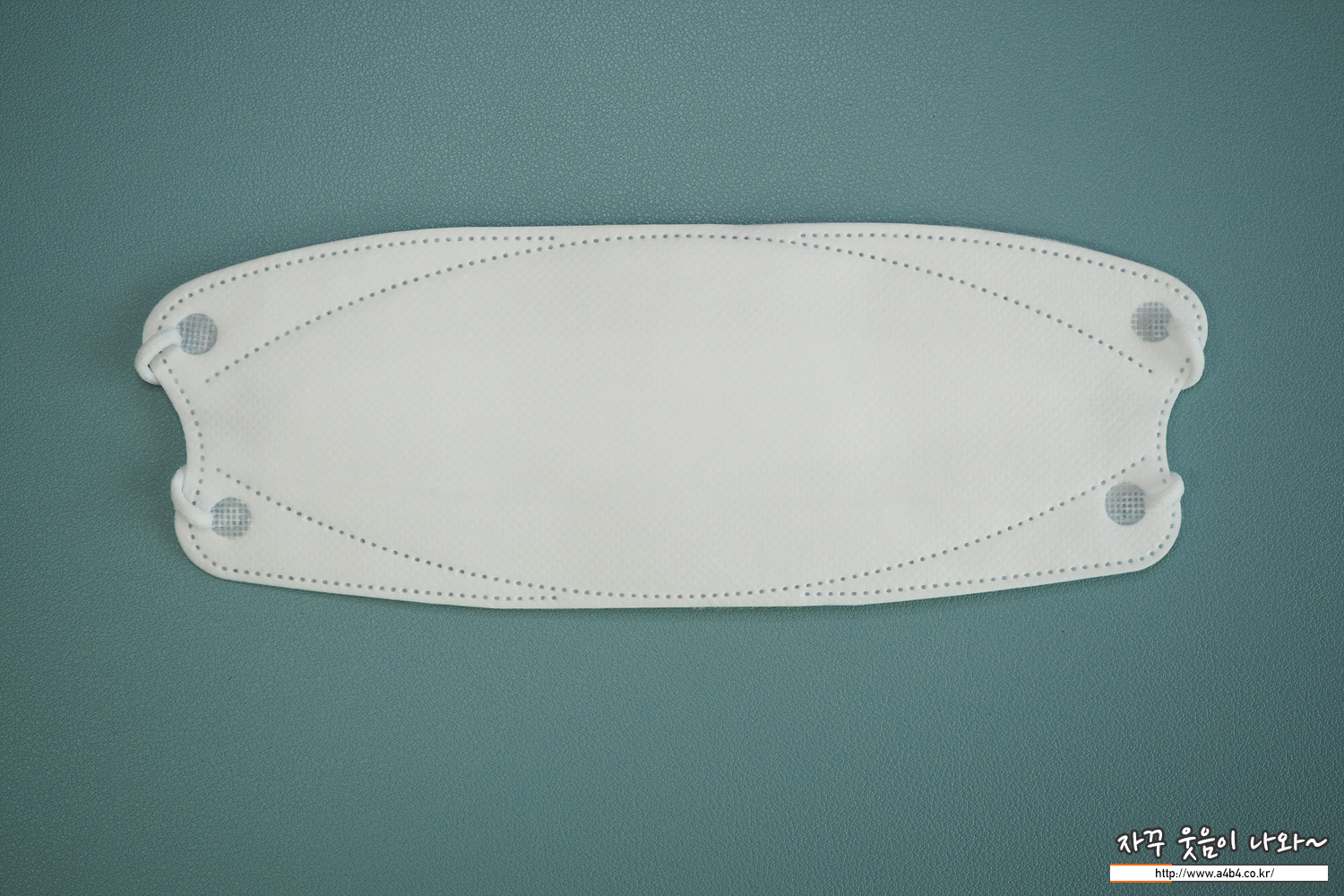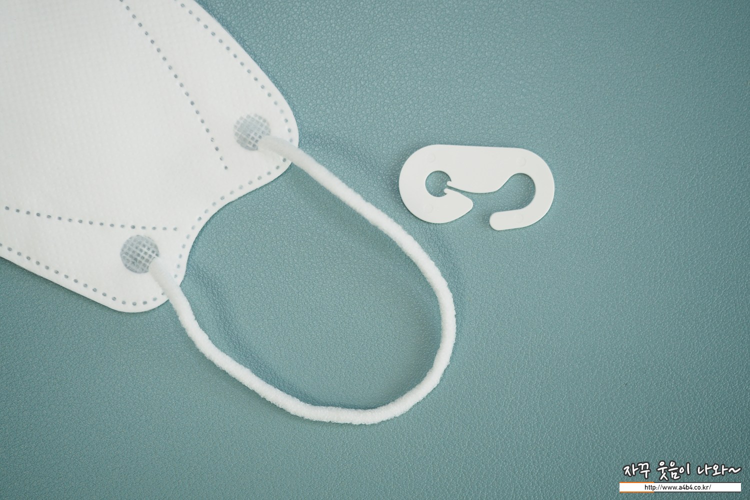 둥근 모양의 귀걸이끈이 마스크 전면에 접착되어 있으며, 고리가 포함된 제품입니다. 이어밴드 접착 상태는 양호하며, 일반적인 수준의 탄성을 보입니다.