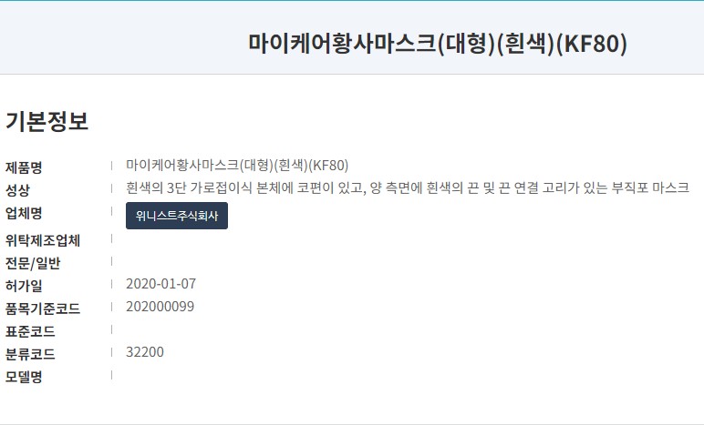 식품의약품안전처에 등록된 제품 명칭은 '마이케어황사마스크 (Kf80)'입니다. 오늘 리뷰하는 대형 사이즈 흰색 외에도 소형과 검정색 제품이 등록되어 있습니다. 마스크 제조사는 '위트니스주식회사'로 작년 1월에 승인된 제품입니다.