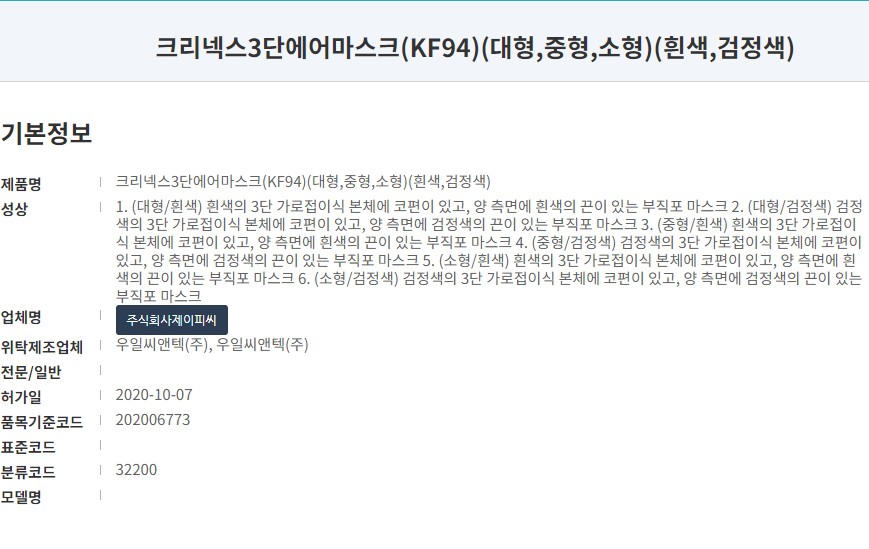 식약처에 등록된 제품명칭은 '크리넥스3단에어마스크' 입니다. 오늘은 대형사이즈 흰색 제품으로 리뷰를 진행합니다. 작년 10월 허가된 마스크로 제원은 우일씨앤텍(주) / 주식회사제이피씨로 등록되어 있습니다. 바로 이지팜 마스크로 잘 알려진 업체입니다. 유한킴벌리는 판매업자로 표시되어 있네요.