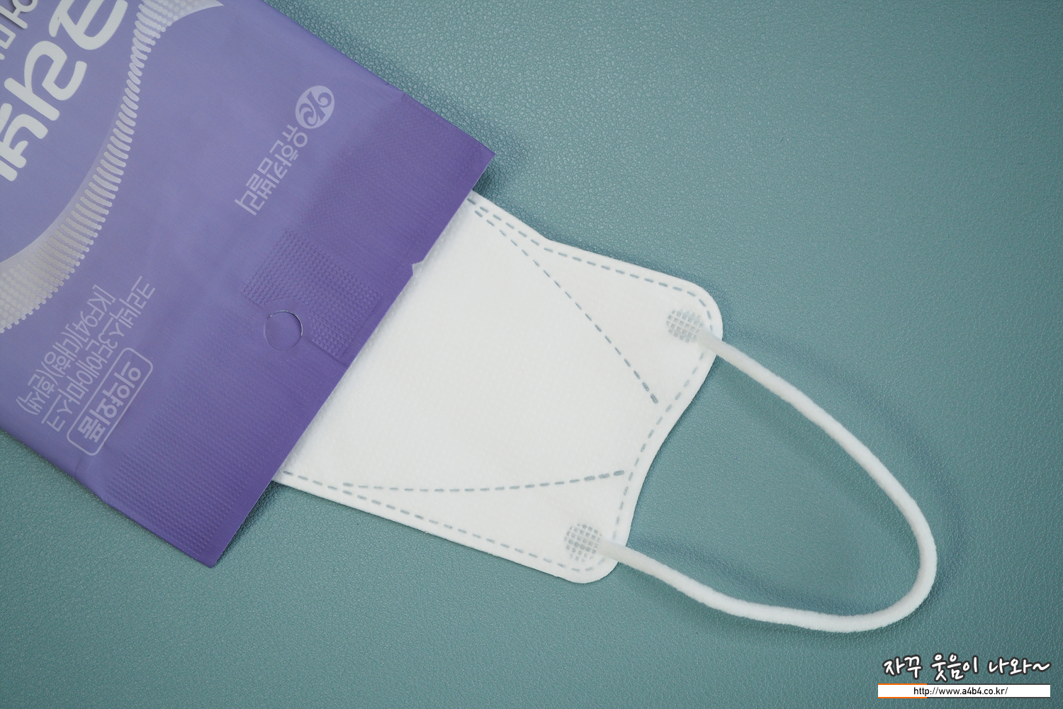 원형의 귀걸이끈이 마스크 앞부분에 접착되어 있으며, 귀걸이끈 탄력은 보통 수준을 보여주고 있습니다.