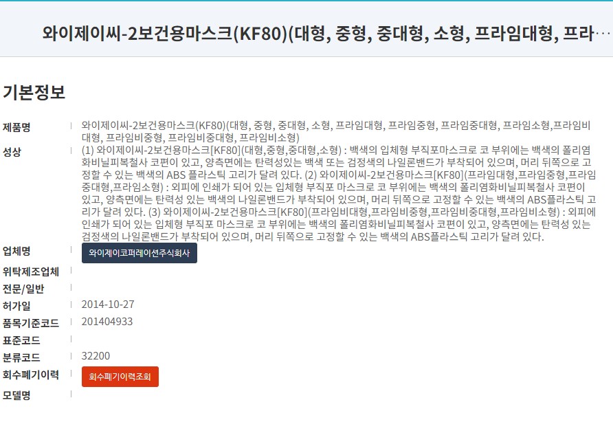 식약처 등록 제품명칭은 '와이제이씨-2보건용마스크'입니다. 대형사이즈 KF80 보건용마스크로 프라임대형부터 프라임비소형까지 약 10여 타입의 사이즈가 등록되어 있는 제품입니다. 14년에 승인된 제품으로 상당히 긴 이력을 가지고 있는 마스크입니다. 마스크 제조원은 '와이제이코퍼레이션'