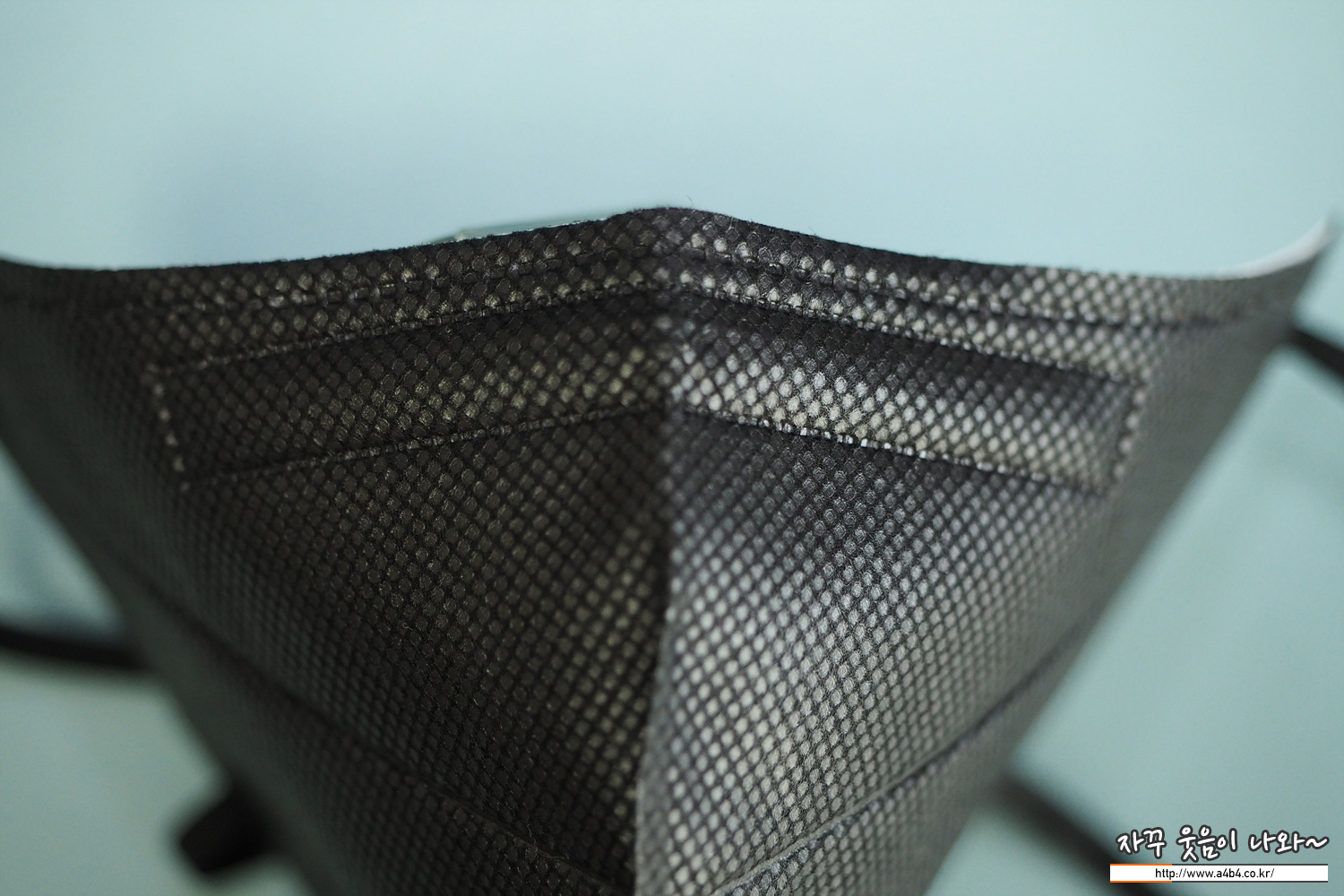 쉼표리빙 마스크 외피는 패턴 처리된 유광블랙 발색을 보입니다. 조명에 따라 반사가 조금 있는 제품입니다.